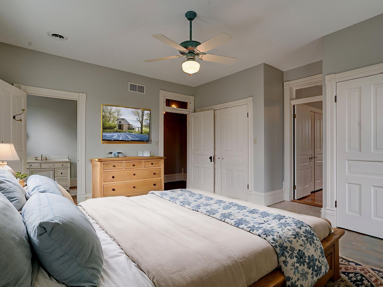 This serene bedroom features a neutral color palette dominated by soft greys, enhancing the calming atmosphere. A large wooden bed with a light quilt and decorative pillows invites relaxation. Adjacent to the bed, a light-colored dresser offers storage and displays a modern television above. Ceiling fans circulate air, with traditional light fixtures providing warmth. Architectural details include classic crown moldings and large white doors that add elegance. A subtle area rug complements the wood flooring, while a small vanity area with a mirror reflects the room’s spaciousness. Dual doorways open to additional spaces, blending functionality with style.