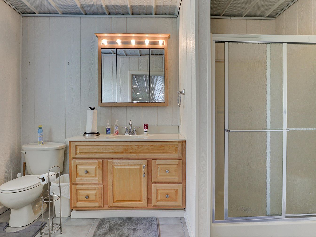 This bathroom features a clean and functional layout. The walls are finished with white paneling, creating a fresh ambiance. A light-colored countertop made of solid surface sits atop natural wood cabinetry, showcasing a warm honey-toned finish with simple drawer pulls. Above, a rectangular mirror is framed in the same wood, illuminated by bright, overhead vanity lights. To the left, a white toilet complements a chrome towel ring, while a wastebasket neatly fits alongside. A glass shower enclosure stands on the right, its frosted glass providing privacy while maintaining an open feel. Soft, gray tiles cover the floor.