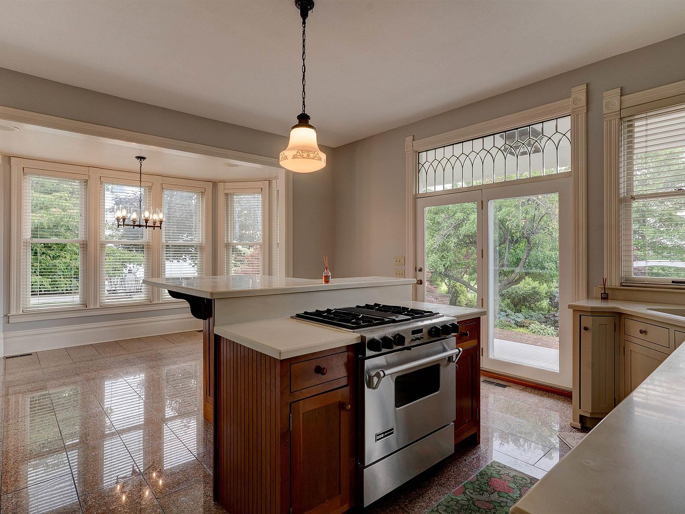 This kitchen features a large, central island with a glossy white countertop, complementing rich wooden cabinetry. The stainless-steel gas range adds a modern touch, while the surrounding space showcases elegant granite flooring that reflects light, enhancing the room’s brightness. Above, a vintage-style pendant light hangs from the ceiling, illuminating the area. Bright bay windows fill the space with natural light, framed by classic white window treatments. A doorway with detailed glass panels connects to the outdoors, surrounded by greenery, creating a serene view. The overall palette is neutral, combining warm wood tones with soft, light hues.