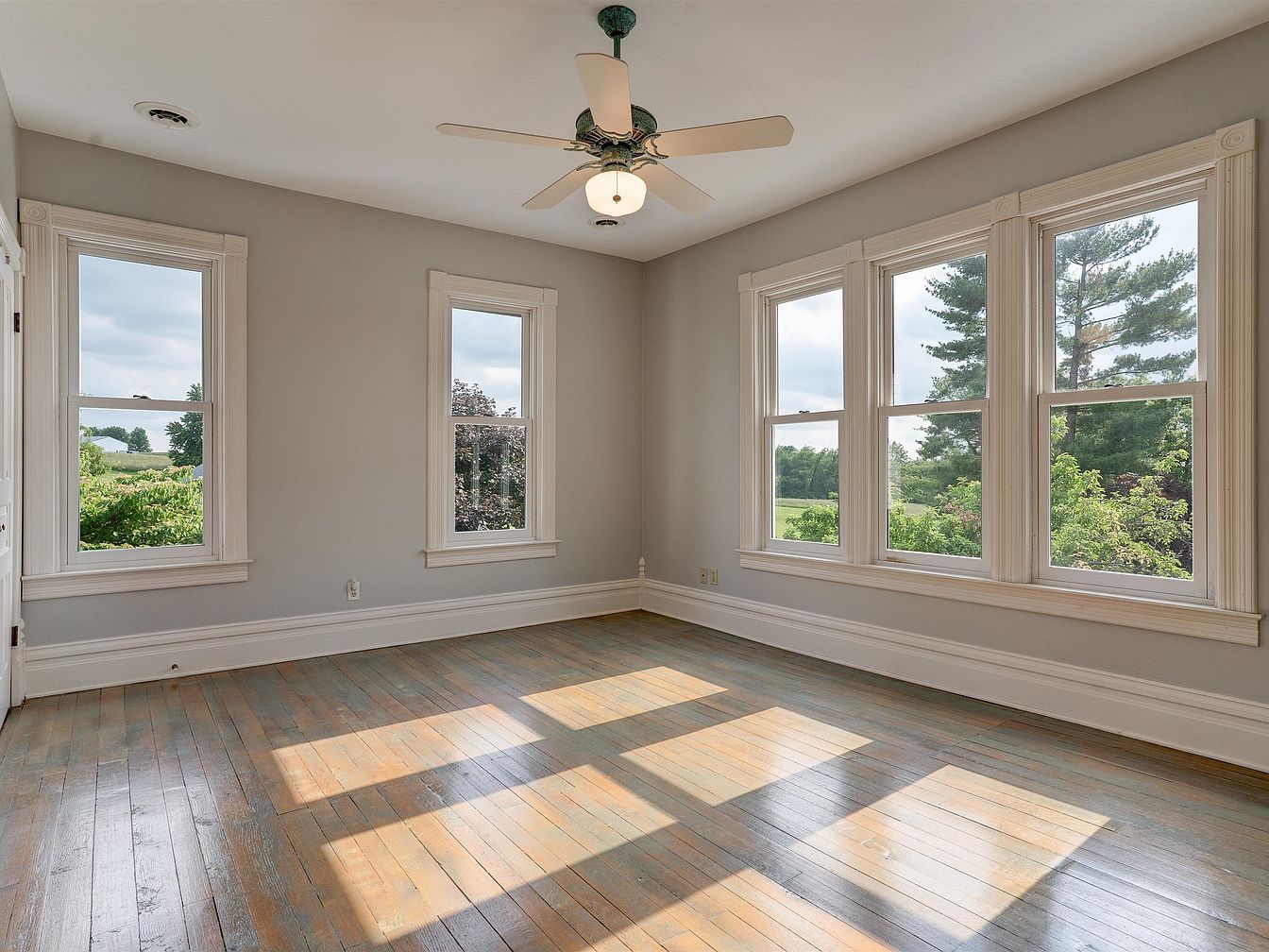 This bright bedroom features three large windows enhancing natural light and showcasing picturesque views of the surrounding greenery. The walls are painted a soft gray, providing a neutral backdrop to the room. Distinctive architectural details include tall white wooden trim around the windows and doors, adding a classic touch. The floor, made of hardwood, exhibits a weathered finish with a mix of light and dark hues, creating a rustic charm. A ceiling fan with a vintage design hangs centrally, merging functionality with aesthetic appeal. This tranquil space invites relaxation and offers a serene ambiance.