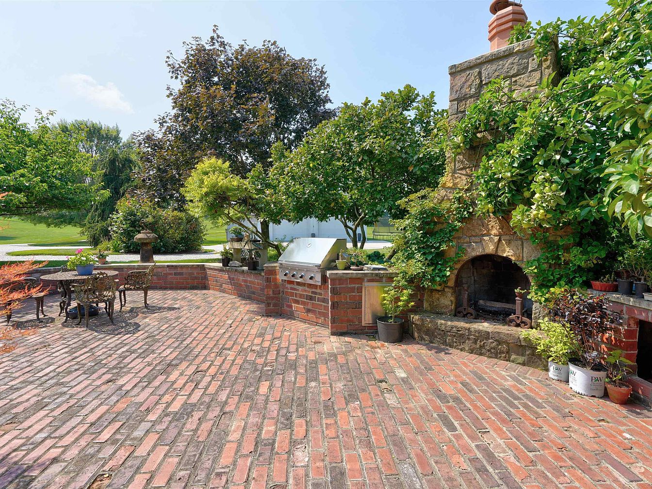 A charming outdoor patio features a rustic brick floor that creates a warm and inviting ambiance. To the right, a grill is set against a stone wall adorned with lush greenery, where ivy and climbing plants cascade down, enhancing the natural feel. A small round table surrounded by wrought iron chairs sits in the foreground, ideal for casual dining or relaxation. Potted plants add vibrant splashes of color throughout, while mature trees provide ample shade. The combination of brick, stone, and greenery exudes a cozy, serene atmosphere, perfect for outdoor gatherings or quiet moments of contemplation.