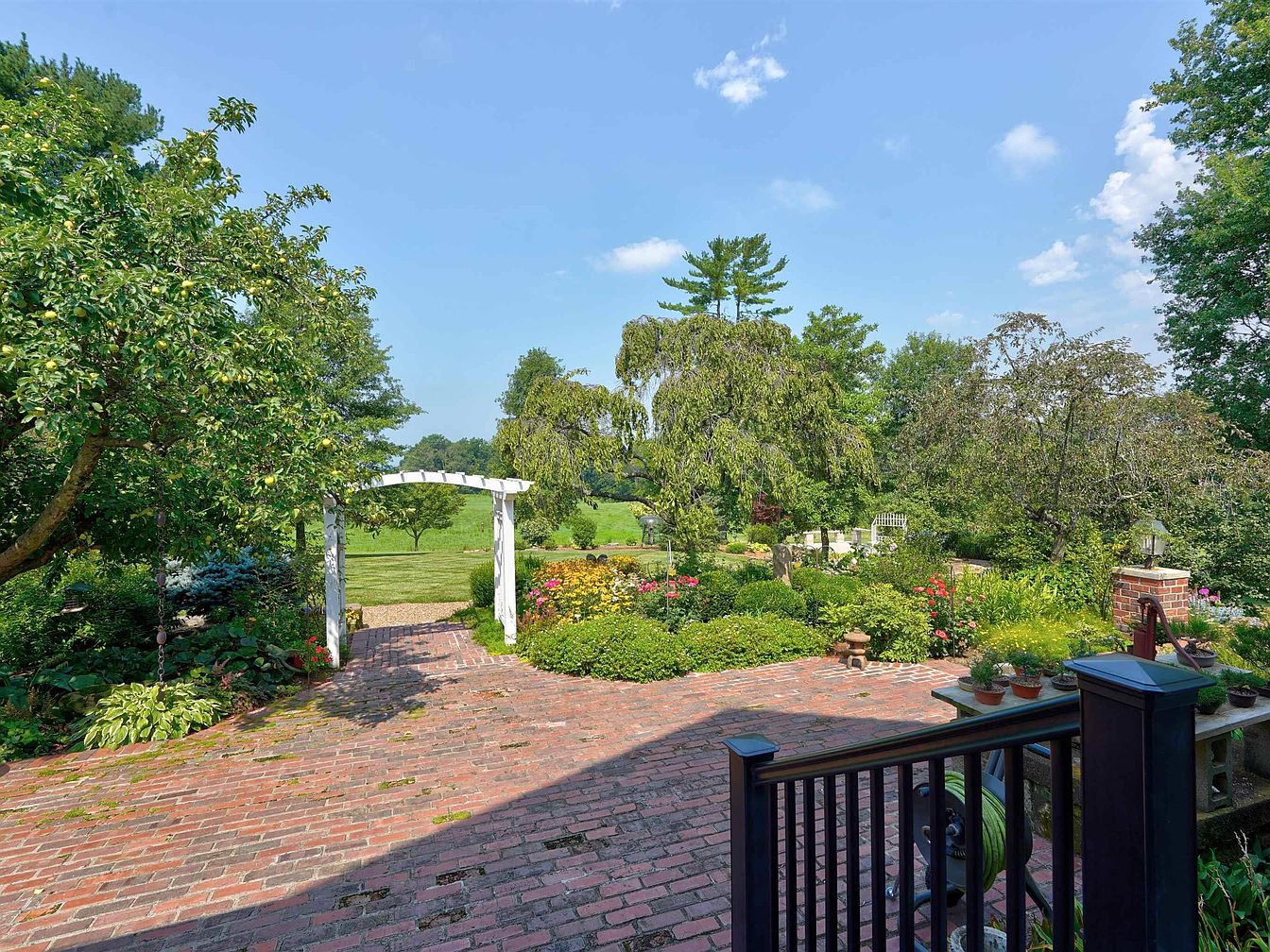 An expansive garden surrounds the historic American home, showcasing meticulous landscaping. Lush greenery contrasts with vibrant flower beds, creating a colorful tapestry. The brick pathways meander through the foliage, guiding visitors through the space, while a pergola adorned with climbing plants adds an inviting architectural feature. The home itself features a light-colored exterior with a metal roof, blending traditional and modern elements. The neatly mowed lawn displays striped patterns, enhancing the manicured look of the property. Towering trees provide shade, complementing the vibrant colors of the garden, making it a picturesque outdoor retreat.