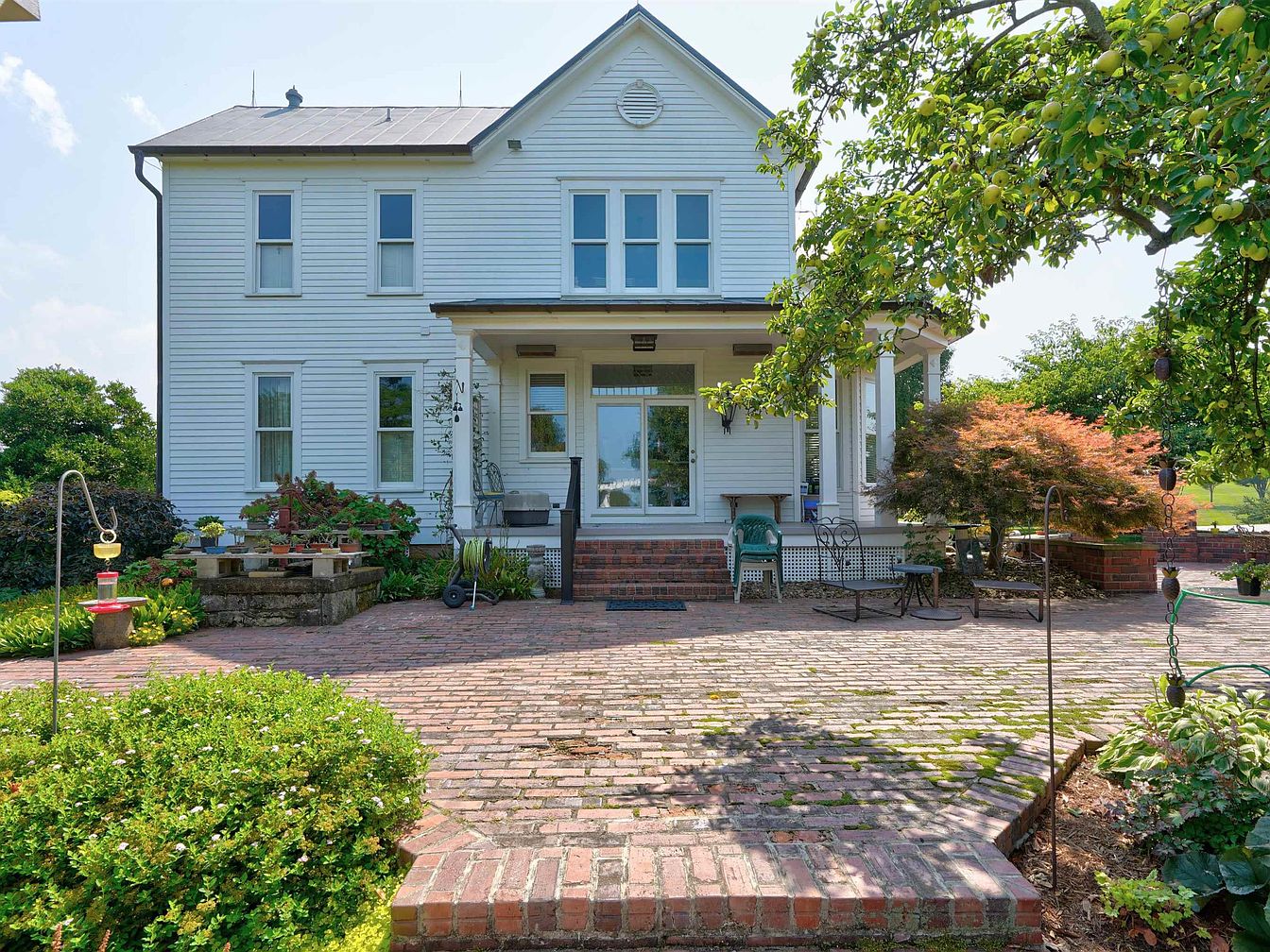 The front entry of the historic home showcases a charming brick pathway leading to a classic porch. Flanked by well-maintained greenery, the white wooden siding of the house contrasts beautifully with the subtle earthy tones of the bricks. Large windows provide ample natural light, while a decorative roof overhang adds character. A patterned brick seating area is visible, paired with wrought iron furniture, inviting relaxation. Lush garden beds filled with plants enhance the serene atmosphere. The vibrant greenery and trees surrounding the home create a warm, inviting entrance, blending nature with traditional architecture.