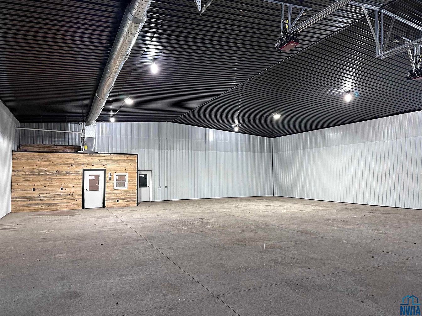 The spacious garage features an expansive, polished concrete floor that extends toward a wooden accent wall. This wall, constructed from rustic timber, injects warmth into the otherwise industrial space. The ceiling is a sleek black, with corrugated panels that create a modern aesthetic. Integrated lighting is strategically placed, illuminating the area without overwhelming it. On one side, two doors offer entry, framed by additional lighting fixtures. The walls are clad in white vertical paneling, enhancing the sense of height and openness. Overall, this garage combines functionality with contemporary design elements, making it an inviting workspace.