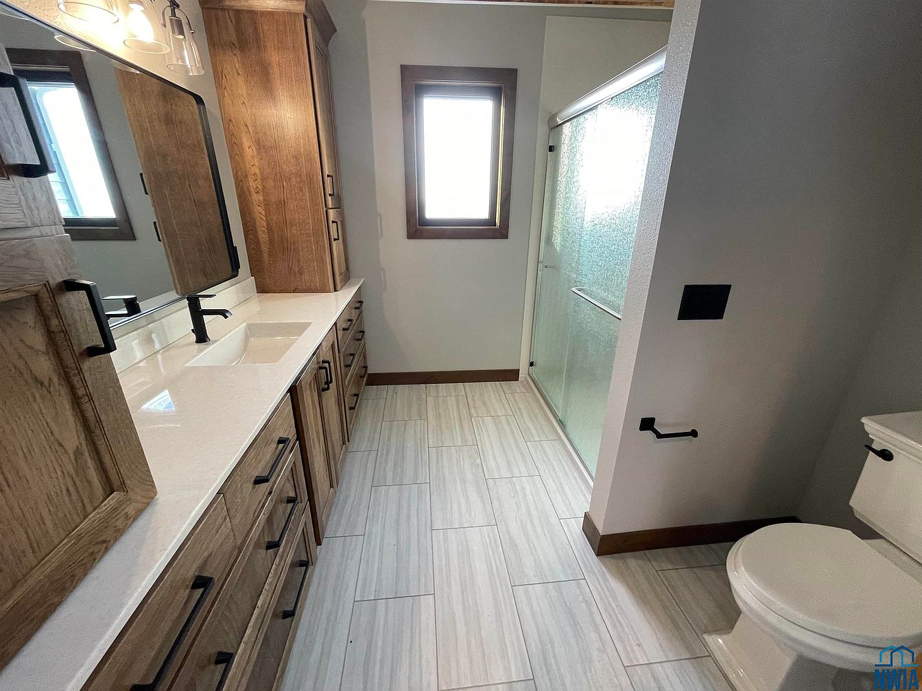 This modern bathroom features a spacious layout with a sleek design. The cabinetry is crafted from warm-toned wood, providing a cozy contrast to the light, durable countertops. A large mirror enhances the sense of space above the dual sinks, which are equipped with contemporary black faucets. Natural light enters through a window framed in dark wood, illuminating the room. Adjacent, a glass shower stall with textured panels offers a luxurious touch, while the light-colored tile flooring provides a seamless look. The toilet is positioned discreetly against the wall, maintaining the bathroom’s clean aesthetic.