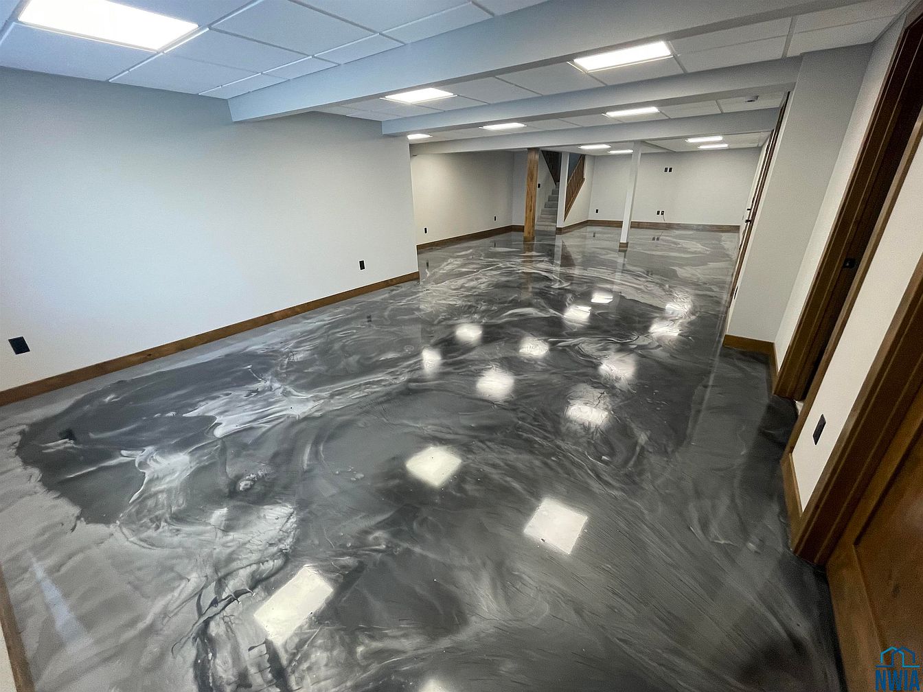 This basement features an expansive layout with a smooth, glossy, gray marbled epoxy floor that reflects ample lighting from the recessed ceiling lights. The walls are painted in a soft white, enhancing the sense of spaciousness. Natural wood accents, including door frames and a stairway banister, add warmth to the modern aesthetic. The combination of gray tones and clean lines creates a contemporary feel, while the minimalist decor allows for versatile use of the space. The area is ready for customization, whether as an entertainment zone, home gym, or additional living space.
