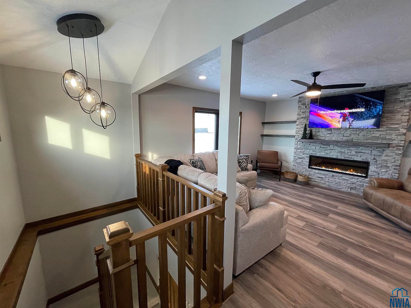 This cozy living room features an open layout with a modern aesthetic. The space is illuminated by a striking three-bulb pendant light above, casting a warm glow. Walls painted in a soft gray complement the rich brown tones of the wooden staircase railing, which leads into the heart of the room. A comfortable beige sofa is positioned around a contemporary, stylish stone fireplace, creating a focal point. Opposite this, a wall-mounted television offers entertainment. Decorative shelving and a plush armchair accentuate the inviting atmosphere, enhanced by warm wood flooring that ties the room together seamlessly.