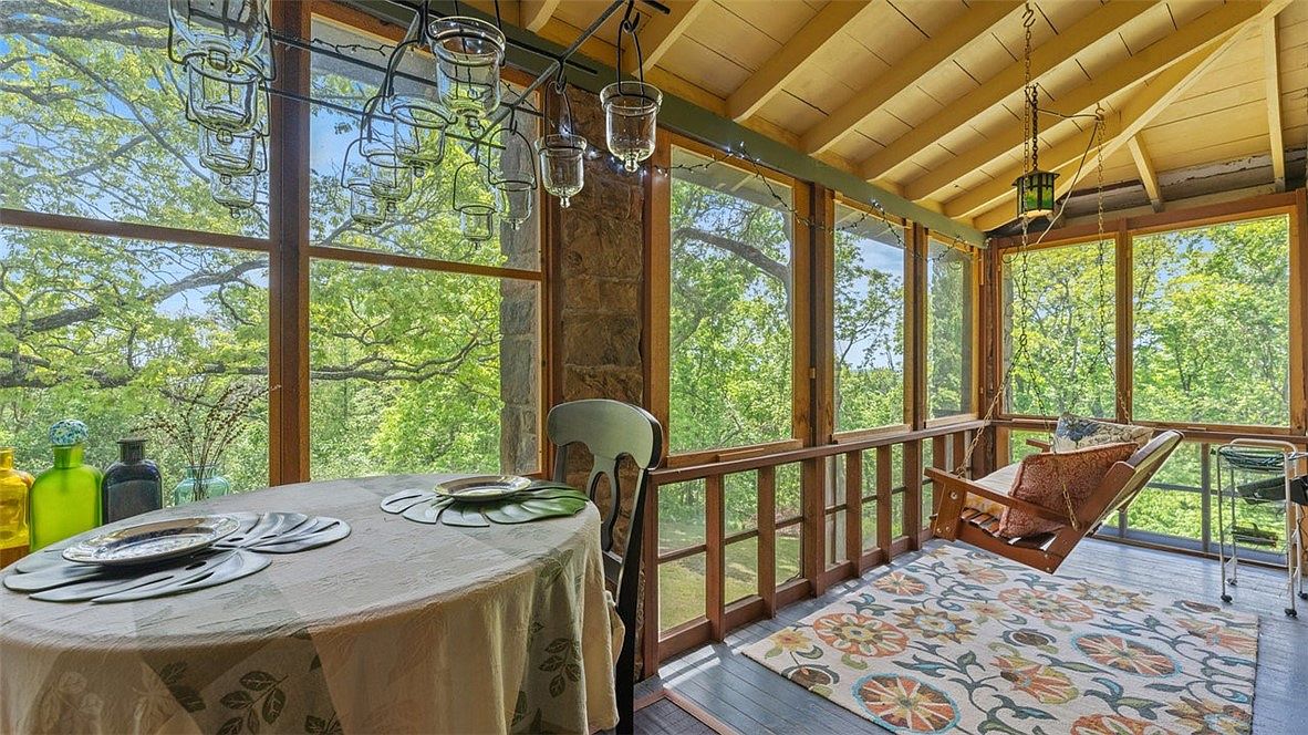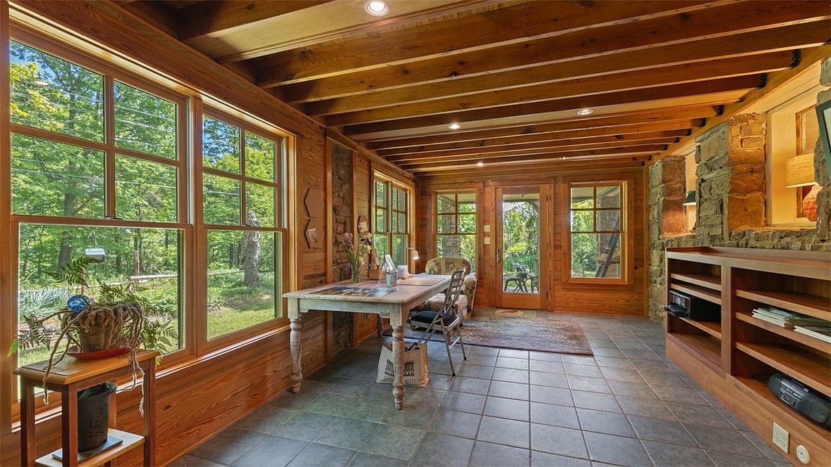 This sunroom features large windows that flood the space with natural light, presenting lush greenery outside. The wood-beamed ceiling adds rustic charm, while the stone wall introduces a textured contrast. A simple wooden table sits at the center, paired with metal chairs, suggesting a cozy dining or work area. Earthy tones dominate the color scheme, enriched by the warm wood and cool stone elements. The tile flooring offers a practical yet stylish surface. A small plant stand in the corner adds a touch of life, while the double doors invite a seamless transition to the outdoor space.