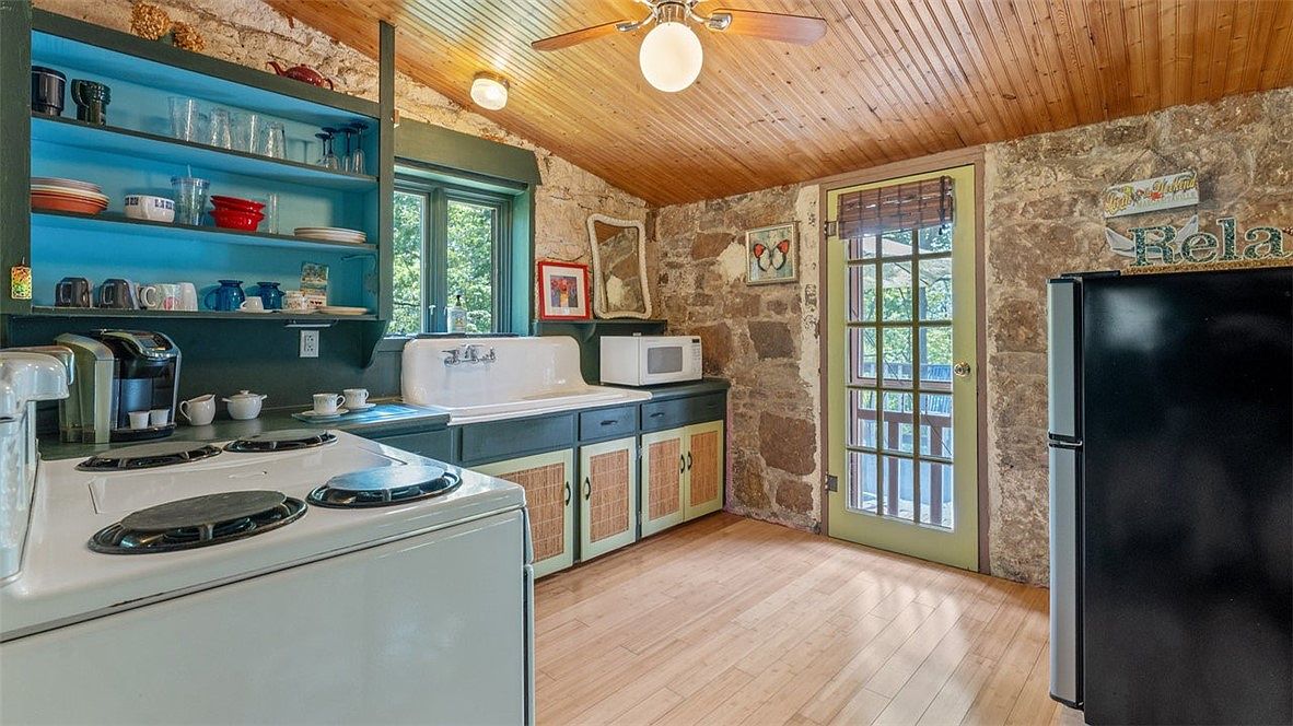 The kitchen features rustic stone walls paired with vibrant blue open shelving, creating a charming contrast. A white farmhouse sink stands prominently against the dark cabinetry, providing a focal point. The dark wood countertops harmonize with the natural wood ceiling, which adds warmth to the space. A compact dining area is well-lit by natural light streaming through the window and glass door. Various colorful dishware is displayed neatly, enhancing the inviting atmosphere. The combination of modern appliances and vintage details offers a blended aesthetic, maintaining both functionality and character in this cozy kitchen.