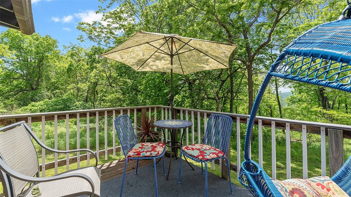 This outdoor balcony showcases a charming seating area adorned with two vibrant chairs featuring floral cushions. A circular table between them provides a cozy space for drinks or snacks. An umbrella offers shade, with its light beige fabric adorned with leaf patterns, perfectly complementing the natural surroundings. The wooden railing enhances the rustic aesthetic, allowing for unobstructed views of lush greenery and vibrant trees beyond. The flooring is adorned with a textured surface, adding depth to the space. The overall ambiance is inviting and tranquil, perfect for relaxation or casual gatherings amidst nature.