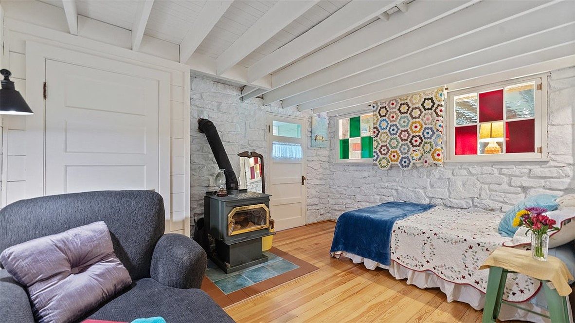 This cozy bedroom features rough-hewn stone walls and wooden beams, giving it a rustic charm. A plush gray sofa is paired with a colorful quilt draped over a simple bed, enhancing warmth. Light-colored wooden flooring complements the inviting atmosphere. Decorative stained glass accents in the windows filter sunlight, casting vibrant patterns across the space. A small wood stove adds character and warmth, positioned on a tiled base, while a wooden side table holds a vase of fresh flowers. The room blends functionality with comfort, creating an intimate retreat perfect for relaxation.