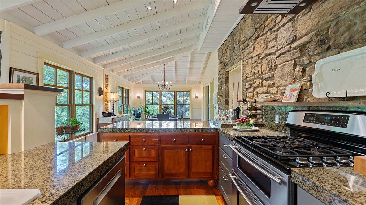A spacious kitchen featuring a blend of rustic and modern aesthetics. The centerpiece is a large, granite-topped island with rich wooden cabinetry, showcasing intricate glass panel detailing. An exposed stone wall complements the sleek, stainless steel appliances, enhancing the rustic charm. White wood beams stretch across the ceiling, creating a bright, airy feel. Natural light floods in through ample windows, illuminating the light-colored wood flooring and subtly colored walls. A stylish black and silver range hood hangs above the stove, while strategically placed shelves and decor add a personal touch, reflecting a warm, inviting atmosphere.