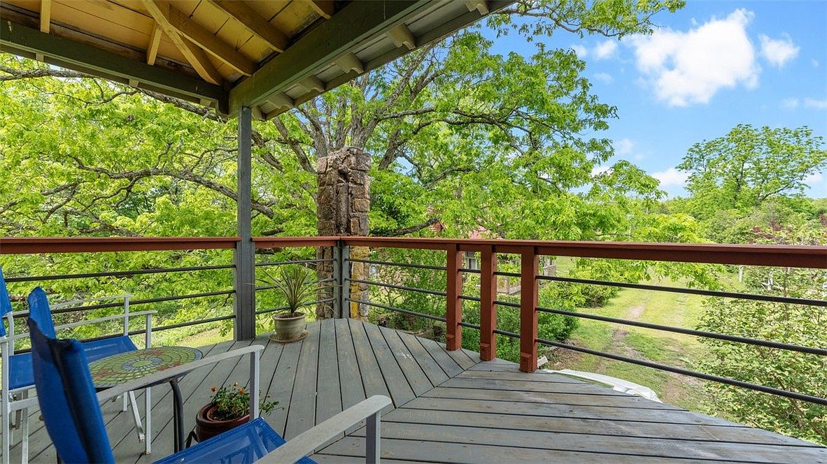 A wooden balcony showcases a serene outdoor space, characterized by a light wood floor and a combination of rustic and modern railings. Two blue chairs provide seating, complemented by a colorful mosaic table that adds a playful touch. A potted plant sits nearby, enhancing the natural vibe. Lush green trees surround the area, offering a vibrant backdrop, while a stone chimney structure introduces a rustic element. The slanted ceiling adorned with wooden beams creates a cozy atmosphere. Bright blue skies above create an inviting, peaceful setting, perfect for relaxation amidst nature’s beauty.