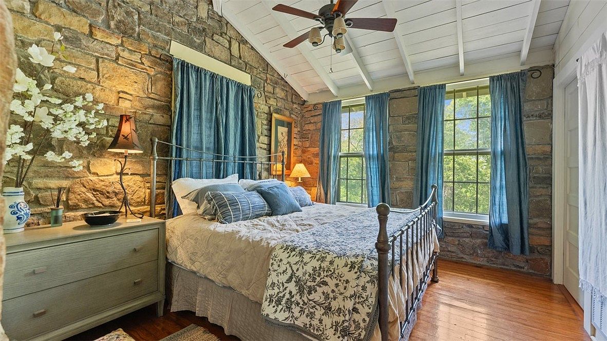 This cozy bedroom features exposed stone walls that create a rustic ambiance. A wrought iron bed is dressed with soft linens, including a textured comforter and decorative pillows, promoting comfort and relaxation. Light blue drapes flanking the windows complement the room’s warm wooden flooring. A bedside lamp casts a soft glow, while a small floral arrangement adds a touch of nature. The ceiling showcases white beams, enhancing the room’s airy feel, and a nearby chest of drawers in a muted tone provides functional storage. Sunlight filters through the windows, illuminating the decor and inviting tranquility.