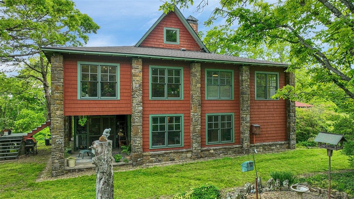 The image showcases a charming two-story house, combining a rustic stone foundation with vibrant red wooden siding. Large, paneled windows adorned with gray-green trim allow natural light to flood in, creating a welcoming exterior. A steep gable roof adds character, accented by a chimney at its peak. Surrounding greenery enhances the home’s tranquil setting, while a small garden features modest landscaping. A staircase leads to the entrance, inviting exploration. The contrast between stone and wood, along with the thoughtful window placement, reflects a harmonious blend of traditional and modern aesthetics, making it an appealing facade.