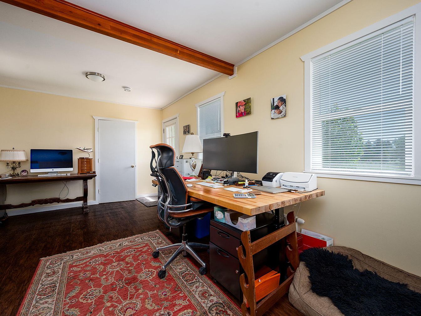 This home office features a cozy layout with soft yellow walls that create a warm atmosphere. A large wooden desk is centered in the space, complemented by a comfortable black office chair. To one side, a sleek computer monitor sits atop the desk, alongside practical office supplies. The floor showcases a richly patterned red rug, adding a touch of elegance. Natural light streams through window blinds, illuminating the room while framed photos on the walls personalize the décor. Architectural details include exposed wooden beams, enhancing the vintage charm of this inviting workspace that balances functionality and style.