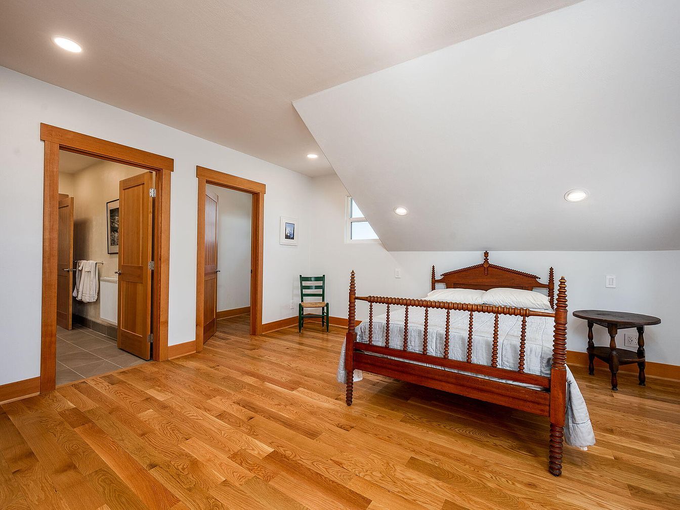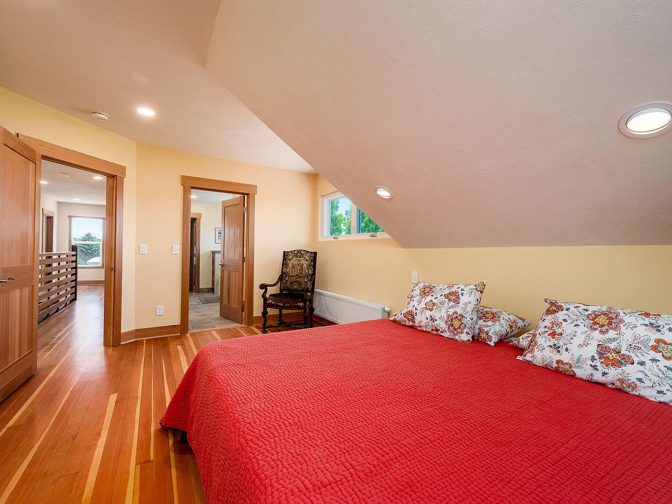 A cozy bedroom featuring a vibrant red quilt covering a double bed, adorned with floral-patterned pillows. The walls are a soft yellow, creating a warm, inviting atmosphere. Natural wood accents, including the polished hardwood floor and door frames, enhance the space’s charm. A vintage-style chair sits in the corner, adding character and a touch of elegance. Two doorways on either side lead to additional rooms, while a window allows ample natural light, complemented by recessed lighting in the ceiling. The slanted roofline adds a unique architectural detail, contributing to the cozy, intimate feel of the room.