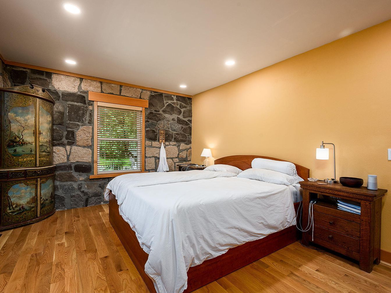 This bedroom features a warm, inviting atmosphere characterized by a harmonious blend of textures. The accent wall showcases natural stone, adding rustic charm alongside a smooth, light-colored wall. A king-sized bed with crisp white linens invites relaxation, framed by minimalistic bedside lamps that provide soft lighting. A wooden nightstand integrates with the rich oak flooring, while a decorative armoire stands out with its intricate painted scenes, enhancing the room’s character. Natural light filters through the window, illuminating the space and enhancing the earthy tones, creating a cozy yet elegant retreat.