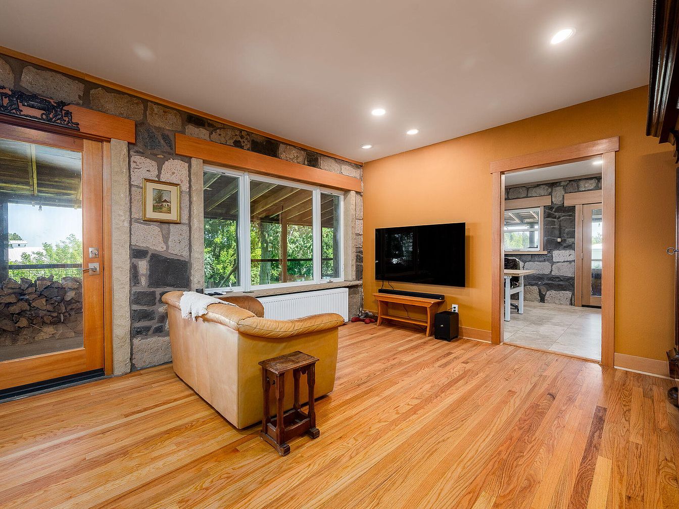 This living room features a warm, inviting ambiance with a blend of rustic and modern elements. The walls are painted a soft, muted orange, enhancing the cozy vibe. A large stone wall adds texture, contrasting with polished wooden flooring that reflects warmth. A comfortable, light-colored couch sits adjacent to a sleek TV mounted on a wooden stand. Bright, natural light floods in through expansive windows offering views of lush greenery. Architectural details include wooden trim around the windows and doorways, harmonizing with the rustic stone and creating a seamless flow to the adjoining spaces.
