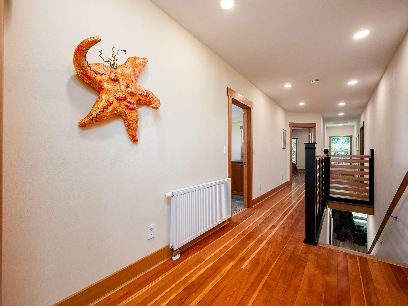 This hallway features a warm wooden floor with rich, horizontal grain, enhancing the inviting nature of the space. Walls are a soft beige, complemented by natural light from nearby windows, creating an airy feel. An eye-catching, vibrant starfish sculpture in hues of orange and red adorns the wall, adding a playful artistic element. The architectural details include wooden door frames with a subtle contrast against the wall color. A steel railing leads to the lower level, emphasizing the open layout. Recessed lighting illuminates the corridor, ensuring the space is bright and welcoming for movement between rooms.