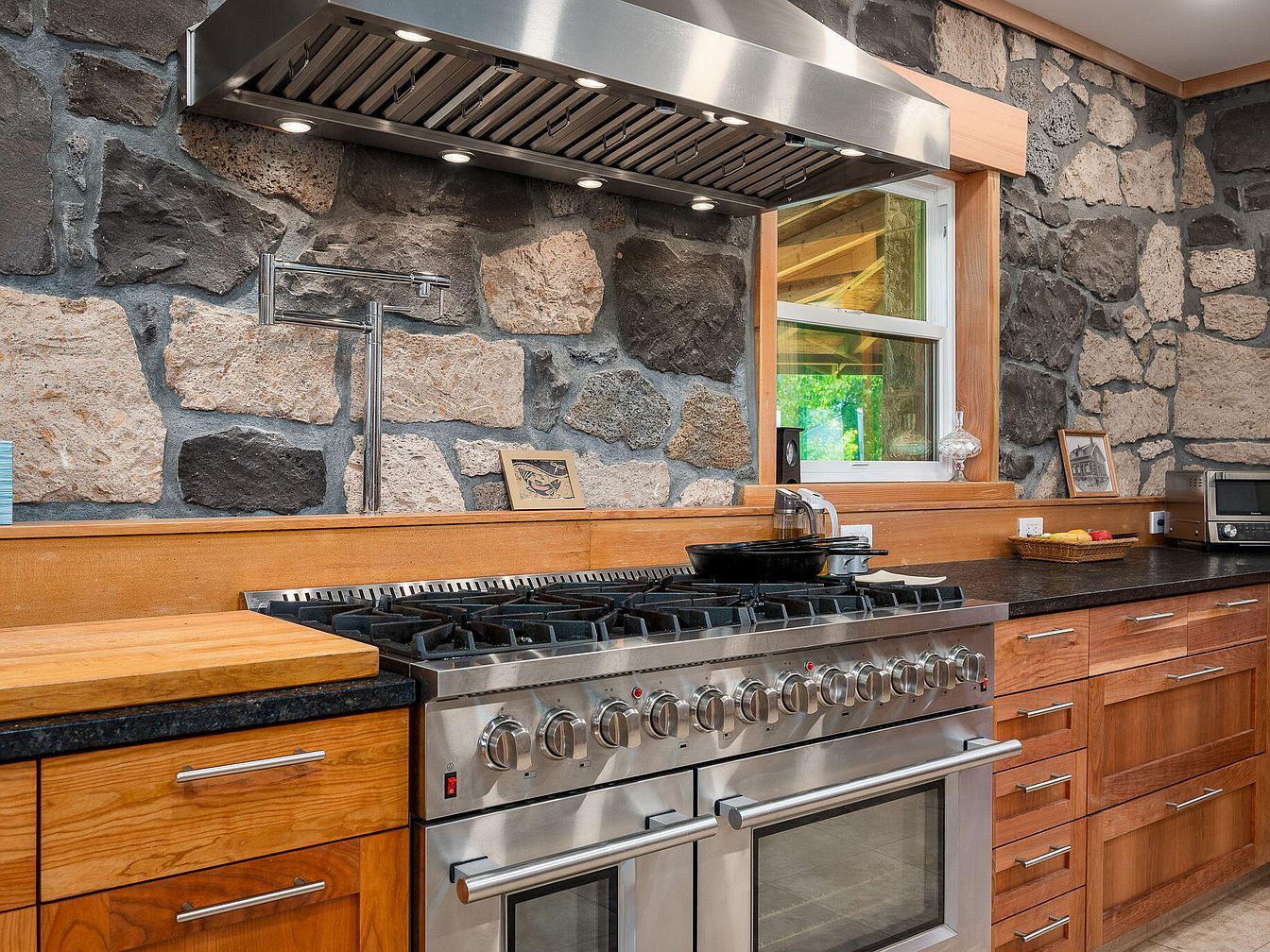 This kitchen features a striking mix of natural elements and modern appliances. The dominant rustic stone wall showcases varied textures in earthy tones, providing a warm backdrop. A sleek stainless steel range with multiple burners stands out prominently, accompanied by an industrial-style exhaust hood. The countertops blend dark granite with warm wood accents from the cabinetry, enhancing the room’s organic feel. Natural light pours through a window framed in soft wood, illuminating the entire space. Decor touches include framed artwork and complementary utensils on the counter, adding personal character while maintaining an organized appearance.