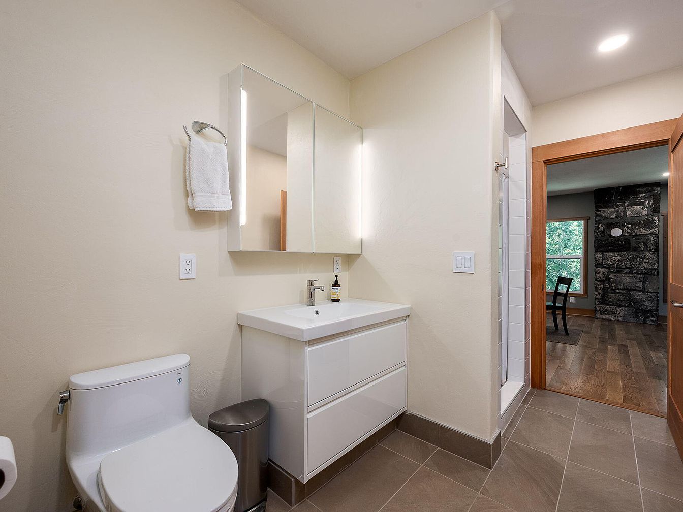 A modern bathroom showcasing a sleek design. The walls are painted in a muted beige, creating a warm atmosphere. A wall-mounted mirror with integrated lighting reflects the soft illumination, enhancing the spacious feel. The vanity features a minimalist white cabinet with clean lines and a contemporary sink. Adjacent to it, a compact toilet is positioned for functionality, while a small, stylish trash bin sits nearby. The floor is laid with large, dark slate tiles, providing a striking contrast to the light walls. Natural light streams in through a doorway leading to another area, hinting at a connected living space.