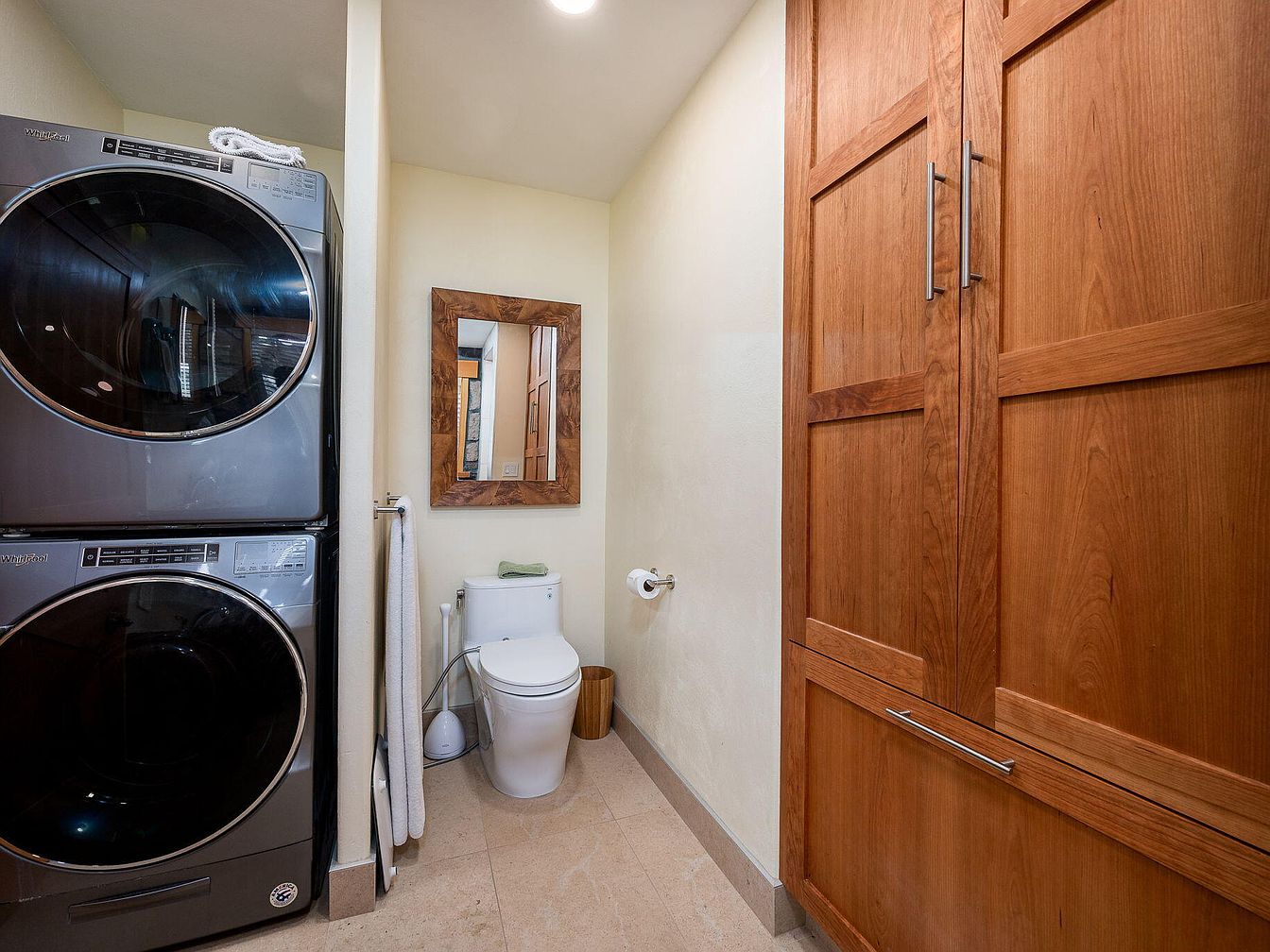 This compact laundry room features stacked gray Whirlpool washer and dryer units, maximizing vertical space. The walls are painted a soft yellow, enhancing brightness, while large cream tiles adorn the floor. A modern, decorative mirror framed in wood adds warmth to the space, contrasting with sleek appliances. To the right, a light wood cabinet offers functional storage, featuring horizontal slats for a contemporary feel, and a stylish handle integrated into the design. A clean white toilet is placed unobtrusively, accompanied by a green towel resting on the toilet tank. Overall, this room blends practicality with modern aesthetics.