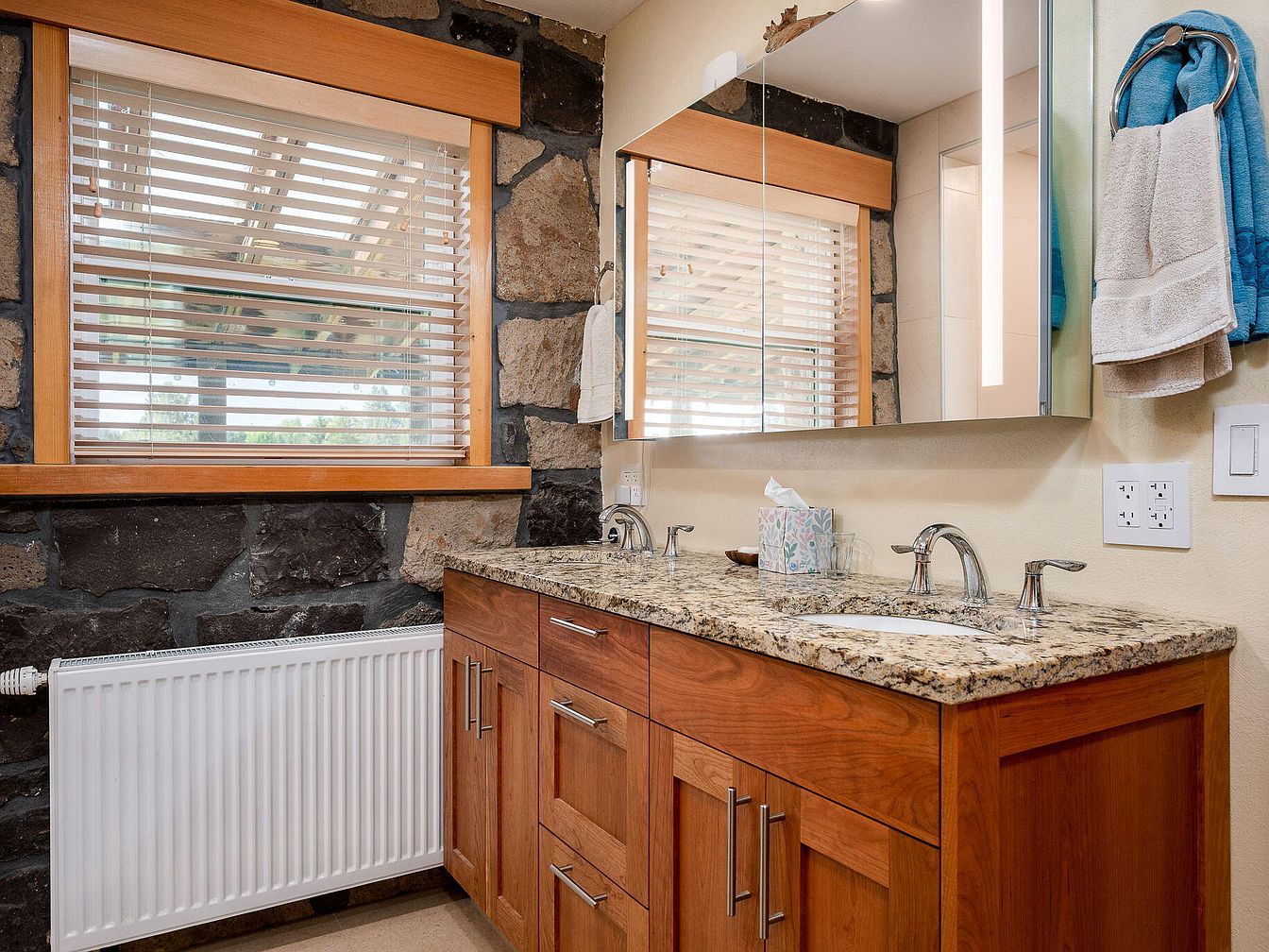 A sleek bathroom showcasing natural stone walls and contemporary design. The countertop features a textured granite surface, complementing the warm wood cabinetry below, which adds an earthy feel. A large mirror reflects light, enhancing the spaciousness. Natural light filters through a window adorned with horizontal blinds, brightening the space. Accessories including vibrant blue towels add a pop of color against the neutral palette. A white radiator and fixtures in brushed nickel offer practicality and elegance. The arrangement promotes a clean, modern atmosphere while maintaining a connection to natural materials, reflecting a harmonious balance between style and functionality.
