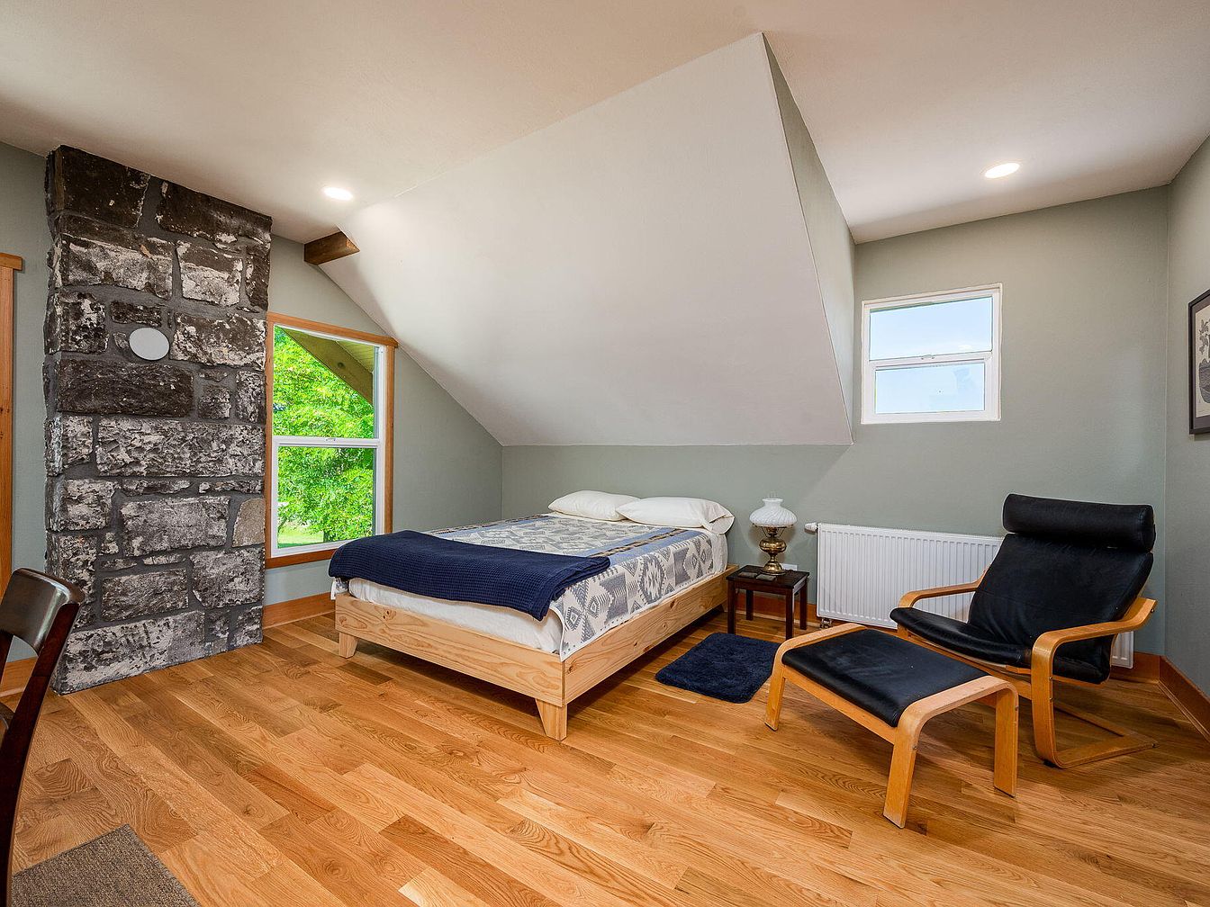 This cozy bedroom features a sloping ceiling and a cozy ambiance. A wooden bed with a patterned comforter is centered in the room, accompanied by a black lounge chair with an ottoman in the corner. The wall behind the bed is adorned with a textured stone fireplace, adding a rustic element. A large window allows natural light to flood the space, showcasing lush greenery outside. The light gray walls create a serene backdrop, while warm wooden floors enhance the inviting feel. A simple bedside table holds a vintage lamp, contributing to the overall charm and comfort of the room.