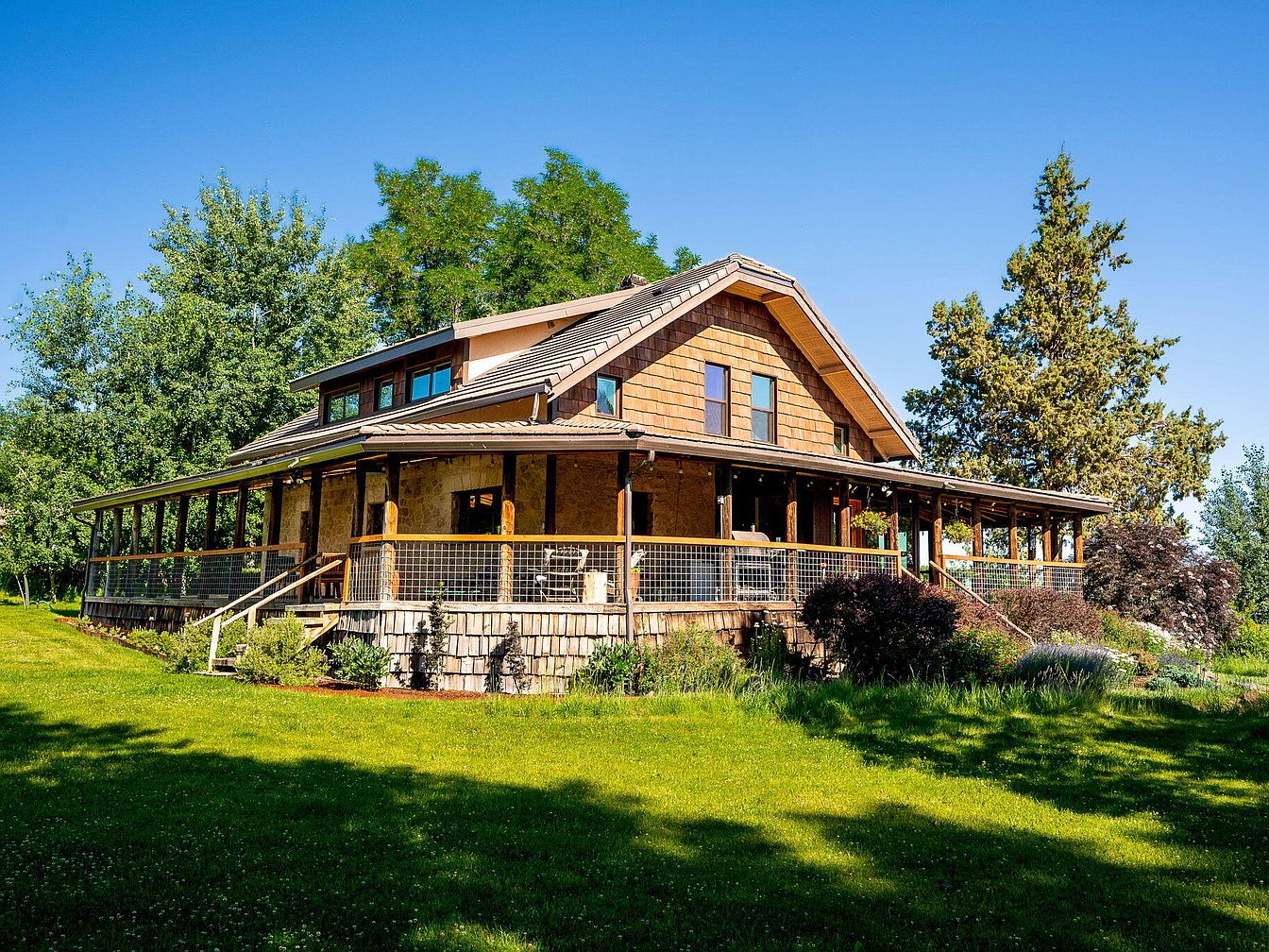 The image shows a picturesque historic American home, featuring a spacious wrap-around porch with rustic wooden railings. The earthy tones of rich brown wood and a slate-gray roof harmonize with the surrounding greenery, creating a warm, inviting atmosphere. Lush trees and manicured lawns frame the house, while a winding stone pathway leads to the entrance. The peaked roof lines and large windows enhance the architectural charm. In the background, majestic snow-capped mountains complete the serene landscape, adding depth and a dramatic backdrop to this idyllic property.