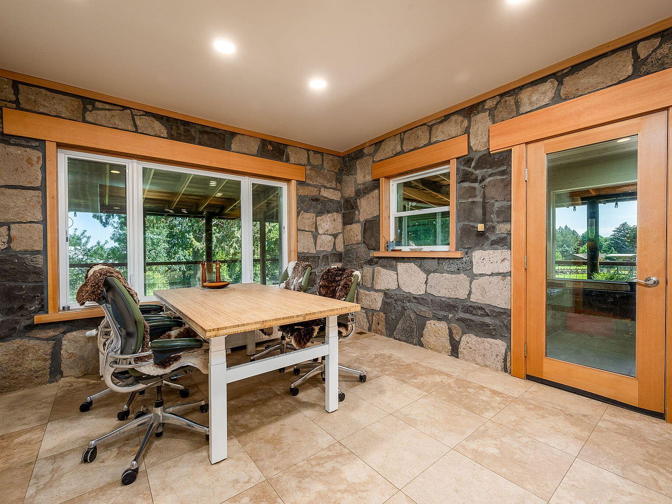 This sunroom office features a striking contrast of natural stone walls and modern furnishings. The centerpiece is a rectangular wooden table with a smooth, light finish, surrounded by ergonomic chairs on wheels, cushioned for comfort. Large windows invite abundant natural light, framing views of the outdoors while enhancing the space’s openness. The soft beige tiled floor complements the stone’s earthy tones, creating a harmonious blend of rustic and contemporary design. Wooden trim accentuates the windows and door, contributing warmth, while the overall layout promotes a productive atmosphere suitable for work or creative activities.