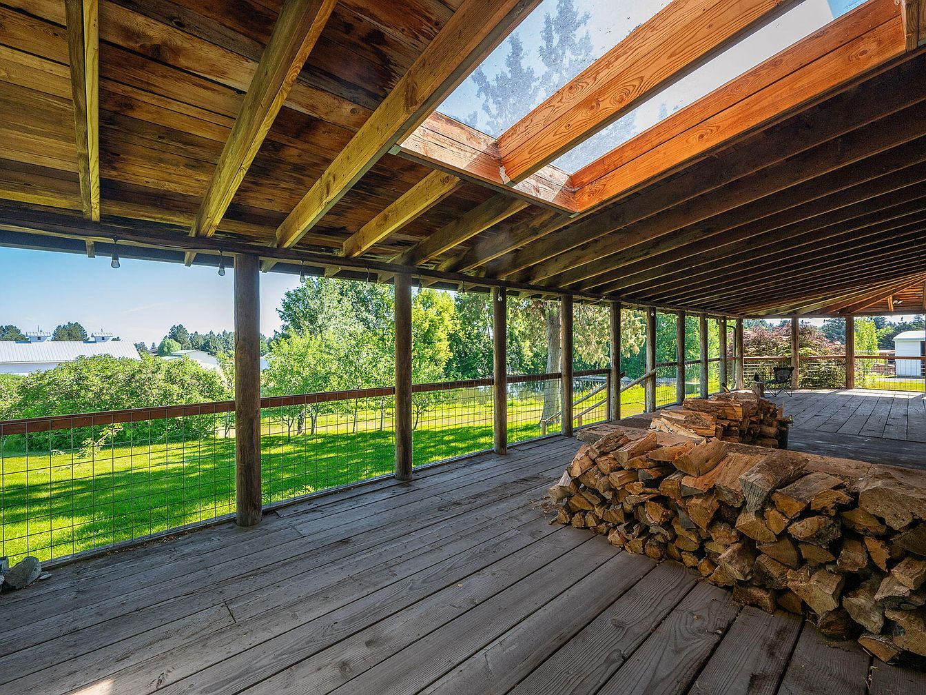 This covered patio features a spacious wooden deck with a rustic charm, highlighted by exposed wooden beams on the ceiling and natural light streaming in through skylights. The rich hues of the wooden flooring complement the sturdy, round wooden posts that provide structural support. A partial railing made of wire allows for an unobstructed view of the lush green yard beyond, where trees flourish. Stacked neatly at one end, logs suggest warmth for a future fire, enhancing the inviting atmosphere of the space. The open layout and connection to nature create a serene spot for relaxation or entertainment.