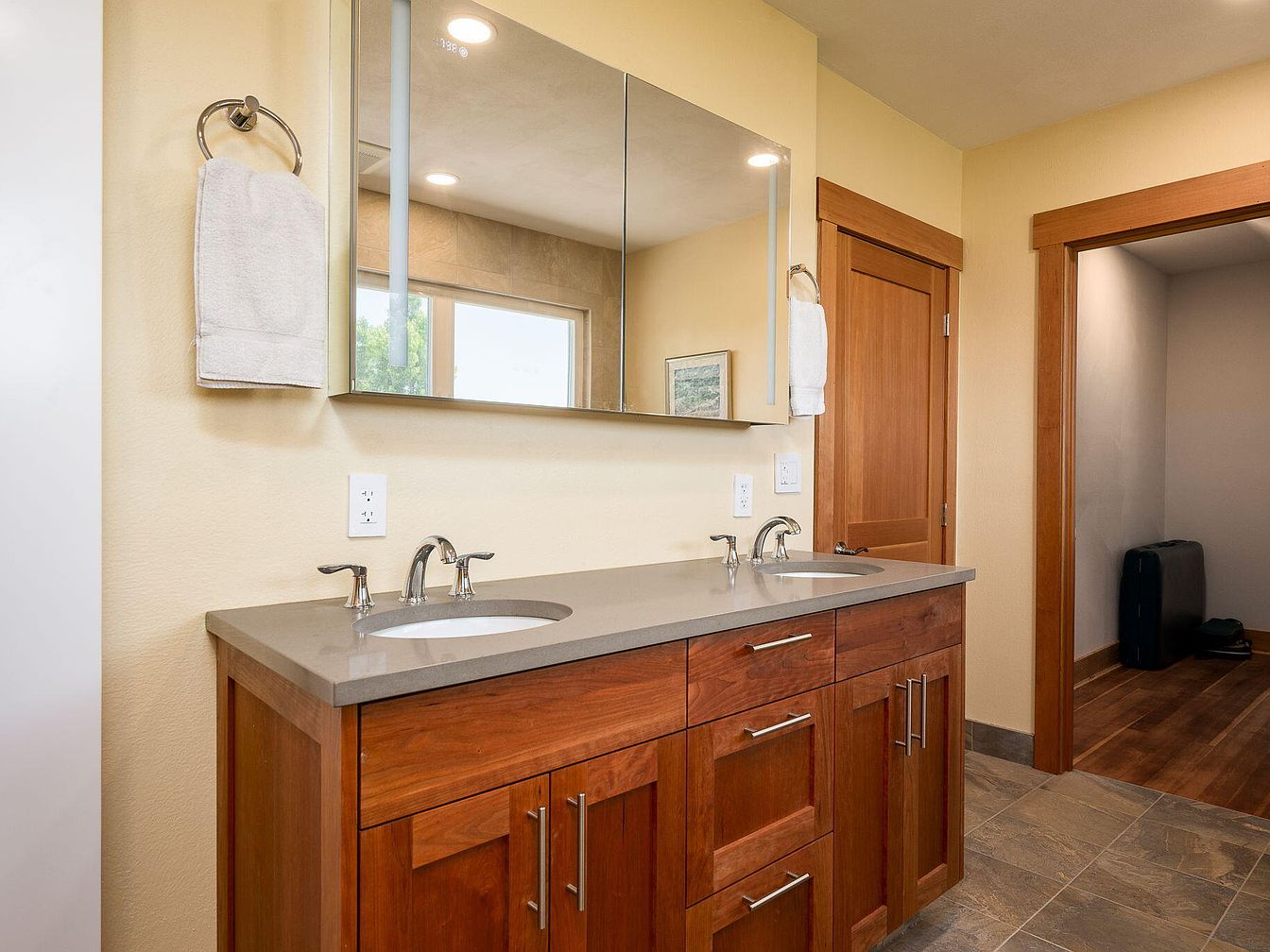 This modern bathroom features a double vanity design, showcasing rich wooden cabinetry with sleek metal handles. The countertops are a smooth, light-gray material that complements the warm beige walls. A large, framed mirror stretches across the back wall, enhancing brightness and creating an illusion of space. Warm LED lighting adds a welcoming glow. A white towel hangs neatly on a circular rack, adding a hint of softness. To the right, an open doorway leads to another room, adorned with wood flooring that contrasts nicely with the slate tile floor in the bathroom, emphasizing a harmonious aesthetic.