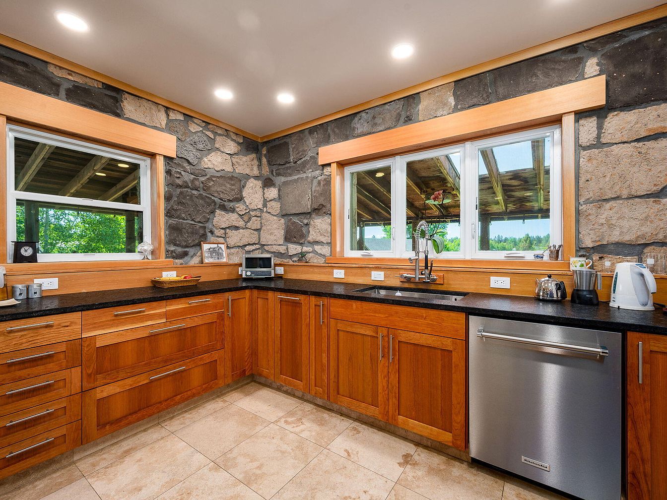 This kitchen features a blend of modern and rustic elements, highlighted by natural stone walls that add texture and warmth. Rich wooden cabinets with sleek metal handles contrast nicely with the dark granite countertop. Ample counter space is organized with appliances, including a kettle and coffee machine, alongside functional items like an under-mounted sink. Large windows provide generous natural light and views of the outdoor scenery, enhancing the open feel. The earthy color palette, featuring browns and beiges, creates a cozy atmosphere. Recessed lighting ensures the space is well-lit, making it inviting for cooking and gathering.