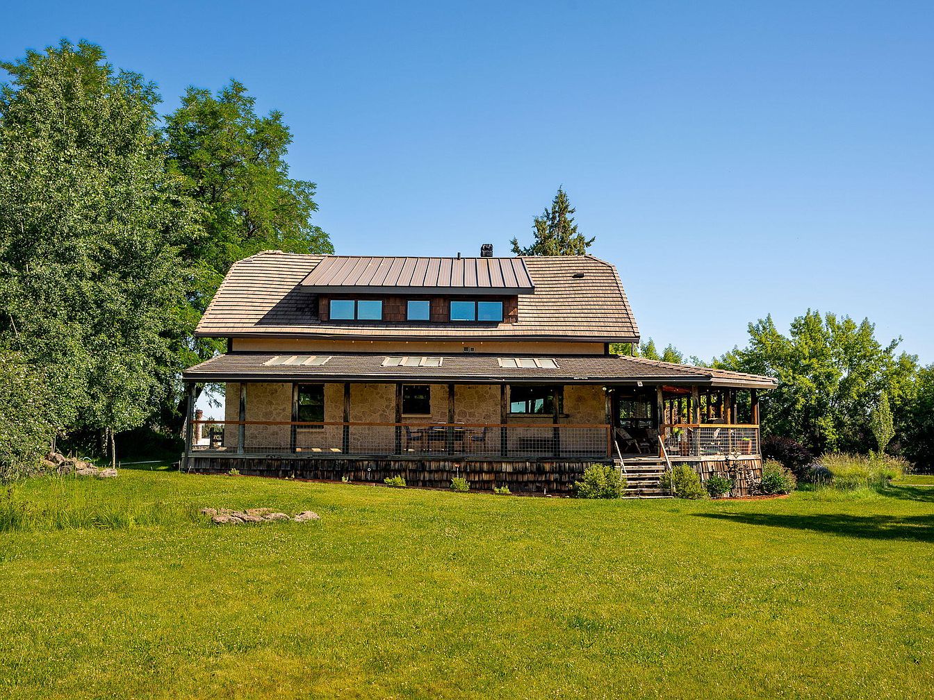 The image showcases a historic American home, characterized by a modern yet rustic aesthetic. The two-story structure features a blend of stone and wood, providing a natural look that harmonizes with its green surroundings. Large windows allow natural light to flood the interior, with an expansive porch extending around the front. The roof, adorned with brown shingles, has a slight pitch, giving it a cozy cabin appearance. Lush green grass frames the base of the house, while trees provide shade, enhancing the tranquil atmosphere. This setting creates a serene outdoor living space for relaxation and gatherings.
