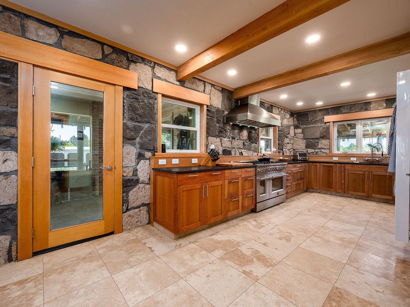 This kitchen showcases an open layout with a blend of rustic and modern elements. Stone walls in rich grays and browns contrast beautifully with warm wood cabinetry featuring sleek lines. A large stainless-steel gas range and hood serve as central fixtures, enhanced by recessed lighting that creates a bright ambiance. Light-colored tile flooring extends throughout, offering a clean and inviting feel. Windows line the walls, allowing natural light to flood the space and provide views of the outside. The design effectively balances functionality and aesthetic appeal, making it a perfect culinary environment.