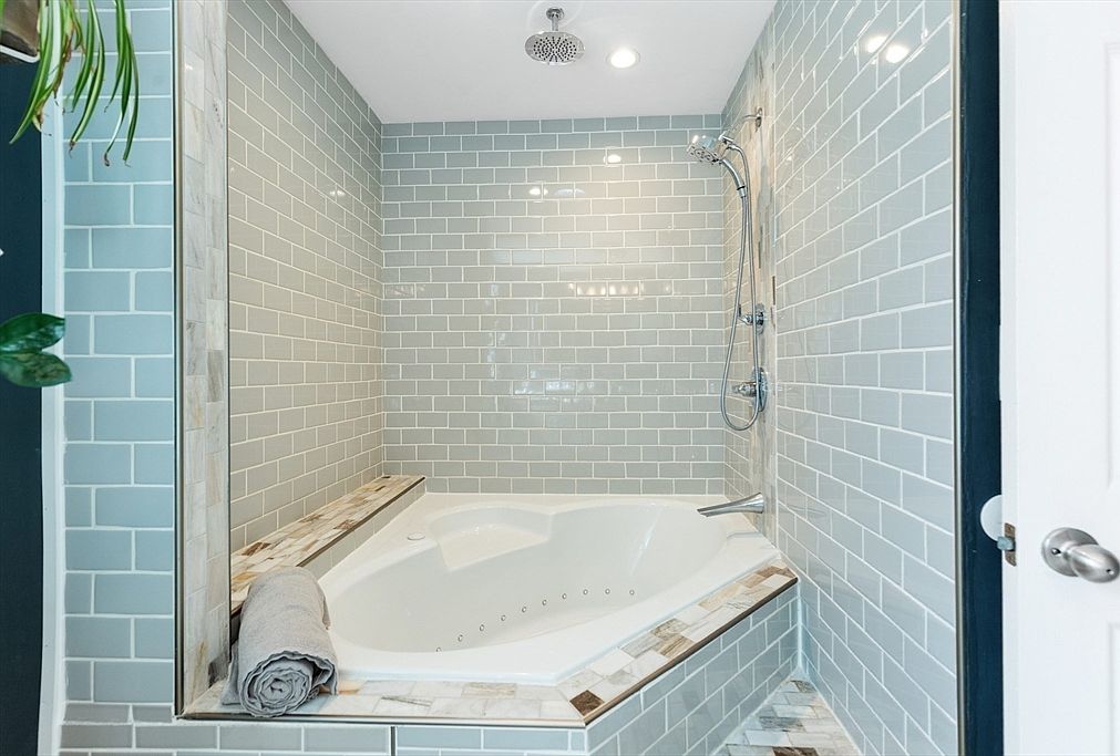 A bright and inviting bathroom nook featuring a large, white jetted soaking tub set into an alcove. The space is framed by sleek, soft-gray subway tiles that cover the walls and tub surround, giving a modern yet timeless look. Subtle variations in the tile’s finish add depth and interest. A built-in ledge with natural stone accents runs along the edge for convenience, topped with a neatly rolled gray towel. Overhead, a rainfall showerhead is mounted on the ceiling, complemented by a handheld shower fixture, blending spa comfort with practical functionality. Recessed lighting adds a gentle, even glow to the serene setting.