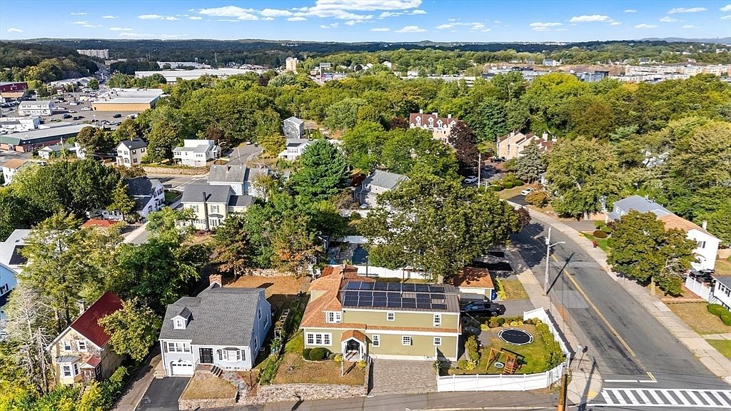 Aerial view of a residential neighborhood featuring a mix of historic and modern homes with tree-lined streets and a blend of mature landscaping. The central house has solar panels on the roof and is surrounded by a manicured lawn and white fencing, with a children’s playset and trampoline visible in the backyard. The home sits on a slightly elevated lot with stone retaining walls and a paved driveway. Streets are orderly, intersecting at a corner lined with sidewalks and crosswalks. Surrounding the area are clusters of homes, pockets of green space, and a commercial district in the distance.