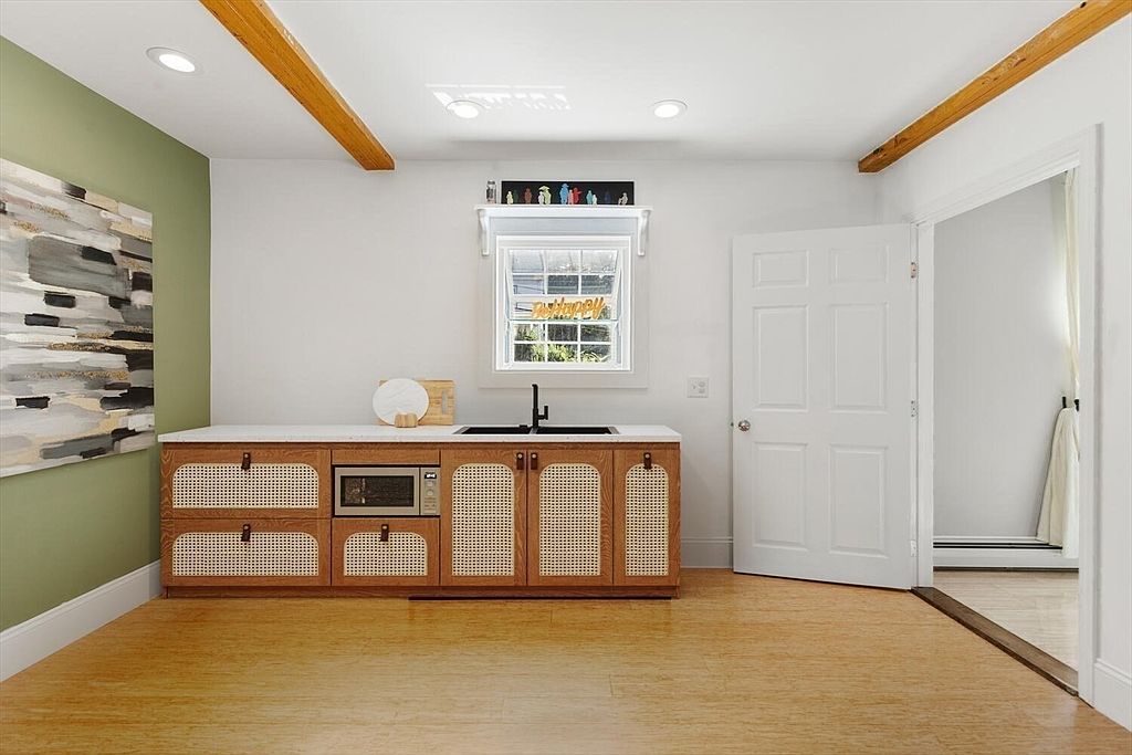 The space features a small kitchen area with natural wood flooring and two exposed ceiling beams, adding warmth and rustic charm. The cabinetry showcases woven rattan panels within a rich, brown wooden frame, topped by a clean white countertop. A black faucet and round decorative tray rest on the counter beneath a central window, which invites daylight into the room. The walls are painted partially in a calming sage green, contrasted by bright white on the remaining walls and trim. Modern recessed lighting ensures brightness, while a wide abstract painting adds contemporary flair. An open white door leads to an adjacent, softly-lit room.