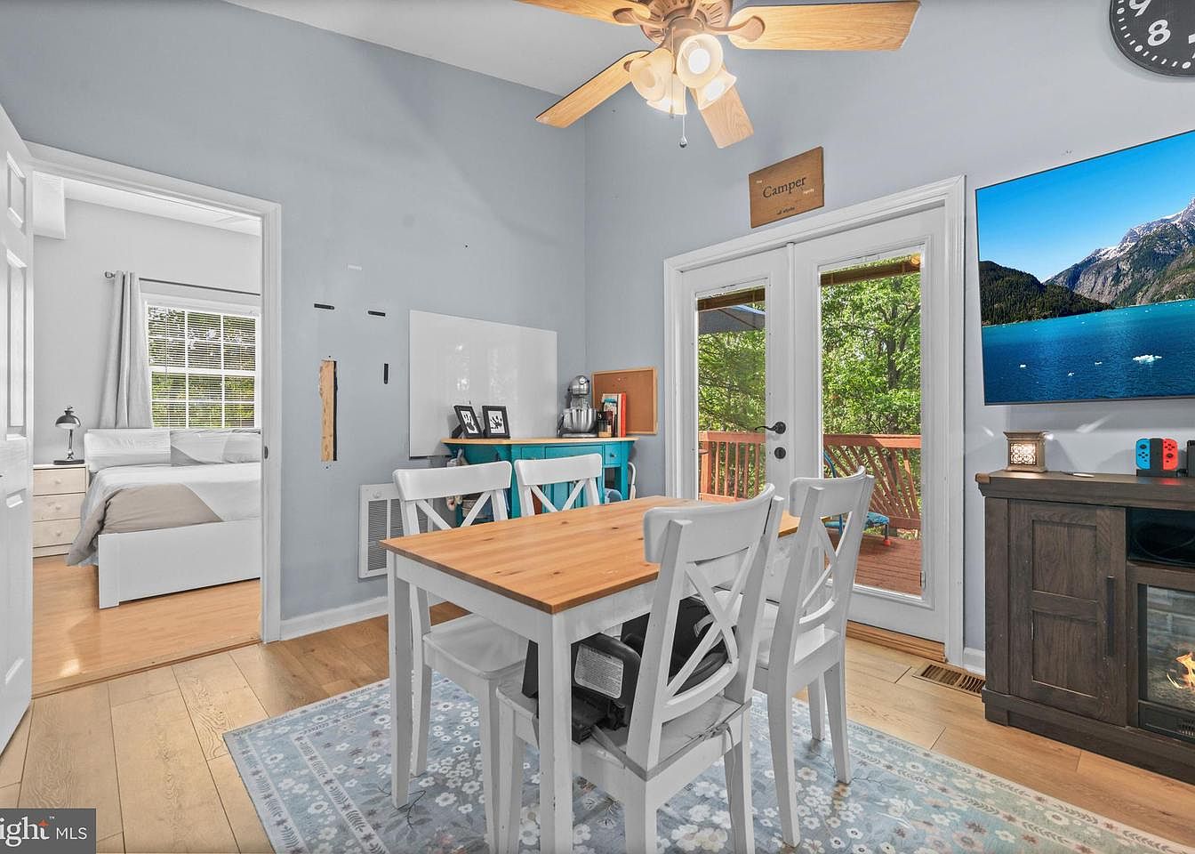 A cozy dining area featuring a rustic wooden table surrounded by four white, criss-cross backed chairs. Light wooden flooring complements the furniture, while a delicate area rug adds texture. Dual glass doors open to a wooden deck adorned with greenery, enhancing the room’s airy feel. A large television mounted on the wall displays a stunning landscape, contrasting against a soft blue backdrop. Natural light floods the space, creating a warm atmosphere. A ceiling fan with wooden blades and a decorative clock accentuate the ceiling, tying together the relaxed, inviting aesthetic of this open-layout room.