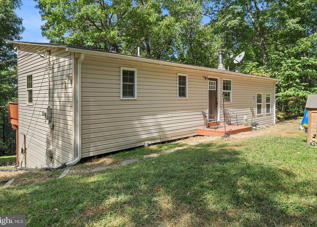 The side of a house is visible, showcasing a modest design with beige vinyl siding. Six windows are symmetrically positioned, accentuating the simple yet functional layout. A wooden deck leads to a door, enhancing accessibility, and features two metal chairs, perfect for outdoor relaxation. Two utility lines run along the wall, indicative of modern amenities. The surrounding grass is well-kept, bordered by natural stones, and the backdrop includes lush greenery, suggesting a serene, forested setting. The combination of earthy tones and natural elements creates a cozy, inviting atmosphere, ideal for enjoying the outdoors.