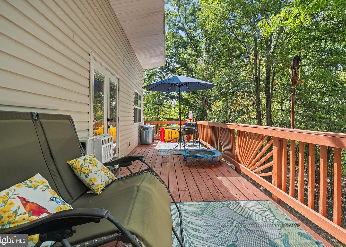 This outdoor deck features a combination of relaxation and functionality. The warm wooden deck is adorned with a textured area rug in soft greens and blues, enhancing its inviting atmosphere. A gray reclining chair, complemented with cheerful floral cushions, offers comfort and a pop of color. A spacious umbrella provides essential shade, while a toddler’s playset sits at the far end, indicating a family-friendly space. Adjacent, a small table and chairs encourage outdoor dining. Lush greenery surrounds the deck, creating a serene and tranquil setting that blends seamlessly with nature.