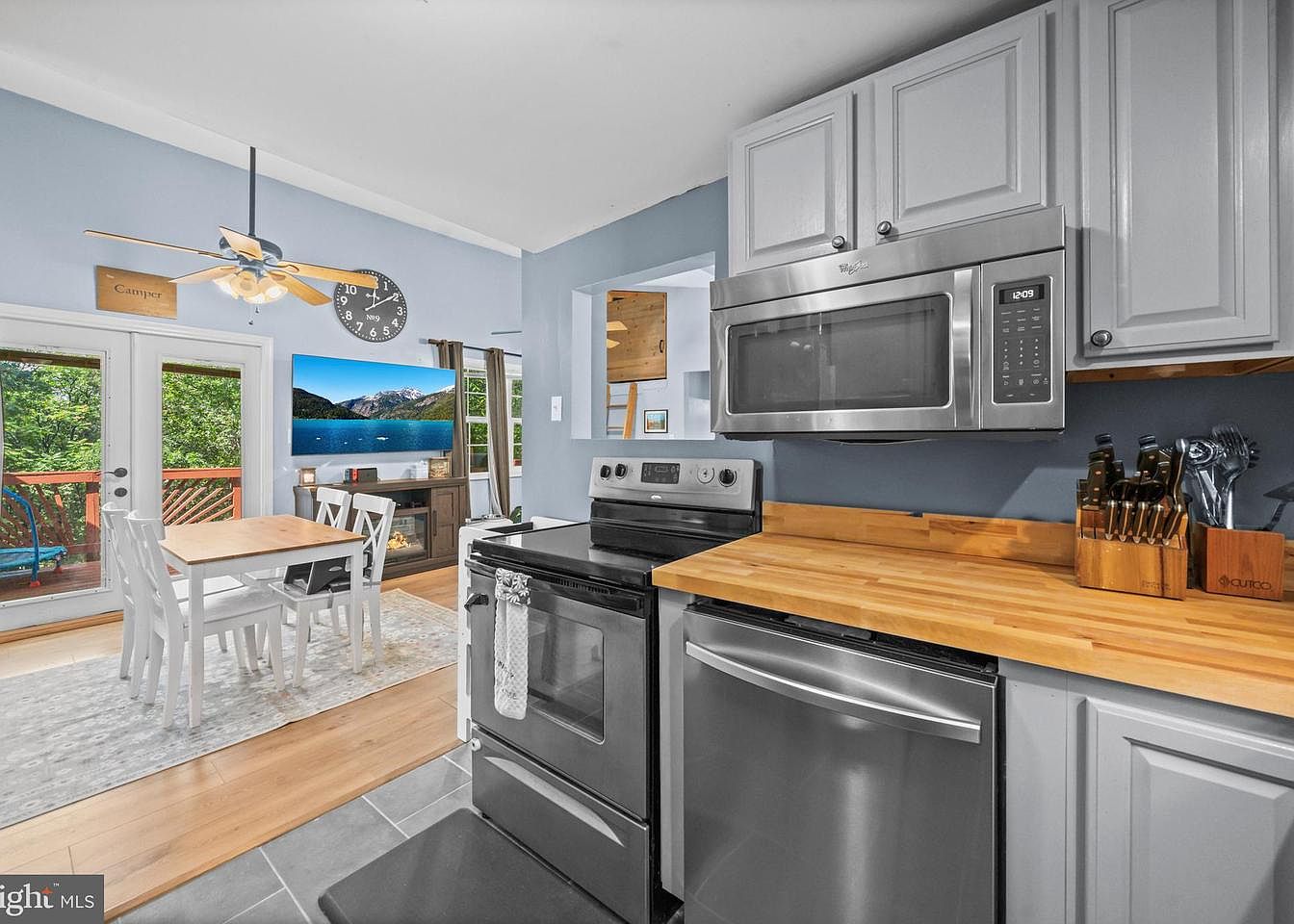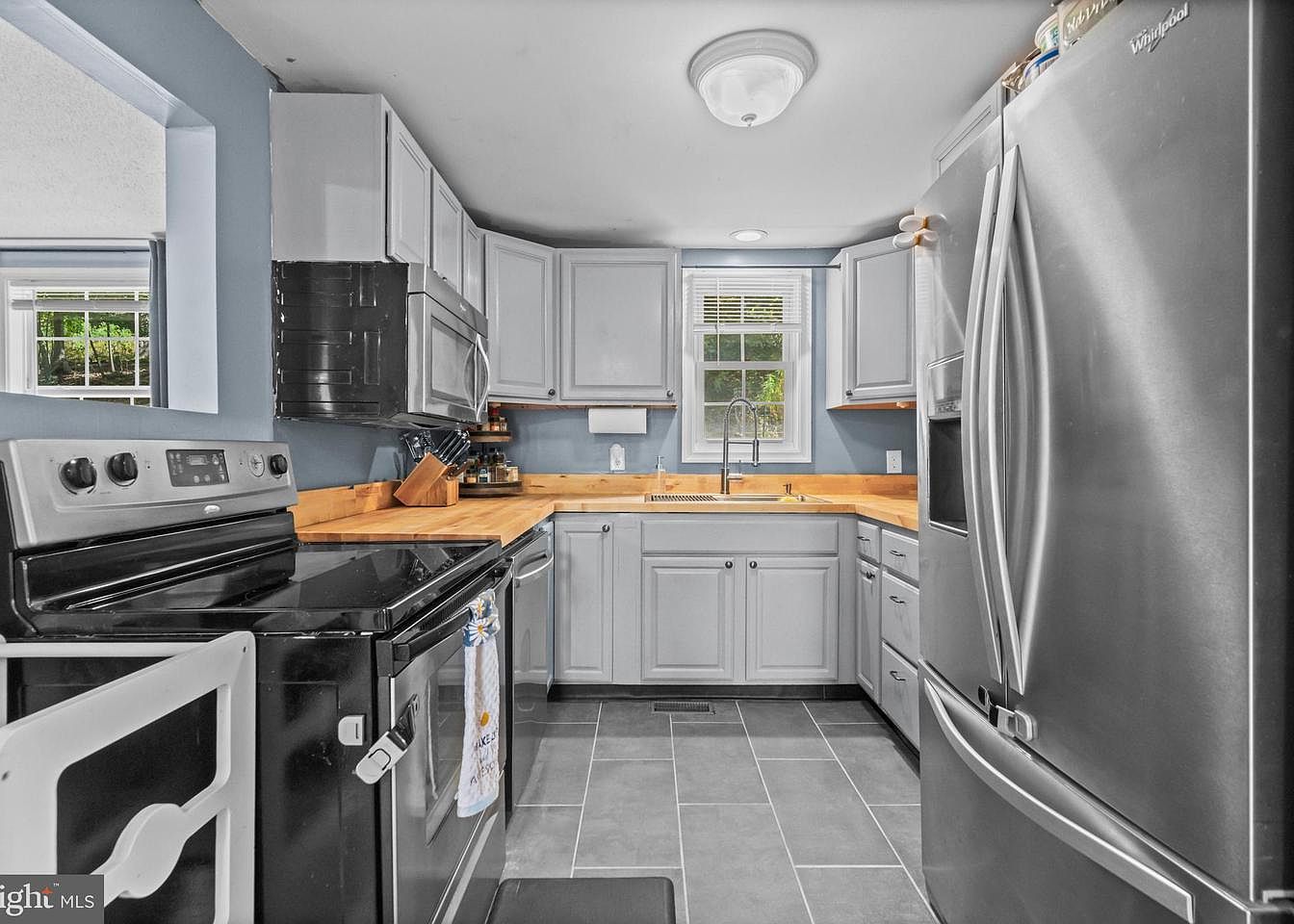 A compact kitchen with a functional layout highlights a blend of modern and classic design. Gray cabinetry contrasts with warm wood countertops, enhancing the space’s inviting feel. A stainless steel refrigerator and range add a contemporary touch, complemented by a sleek black microwave. The color scheme includes light blue walls that brighten the area, while a window invites natural light, illuminating the workspace. Gray tile flooring provides durability, contrasting nicely with the wood accents. The sink is well-placed beneath the window, offering a pleasant view while preparing meals, embodying a balance of style and practicality.