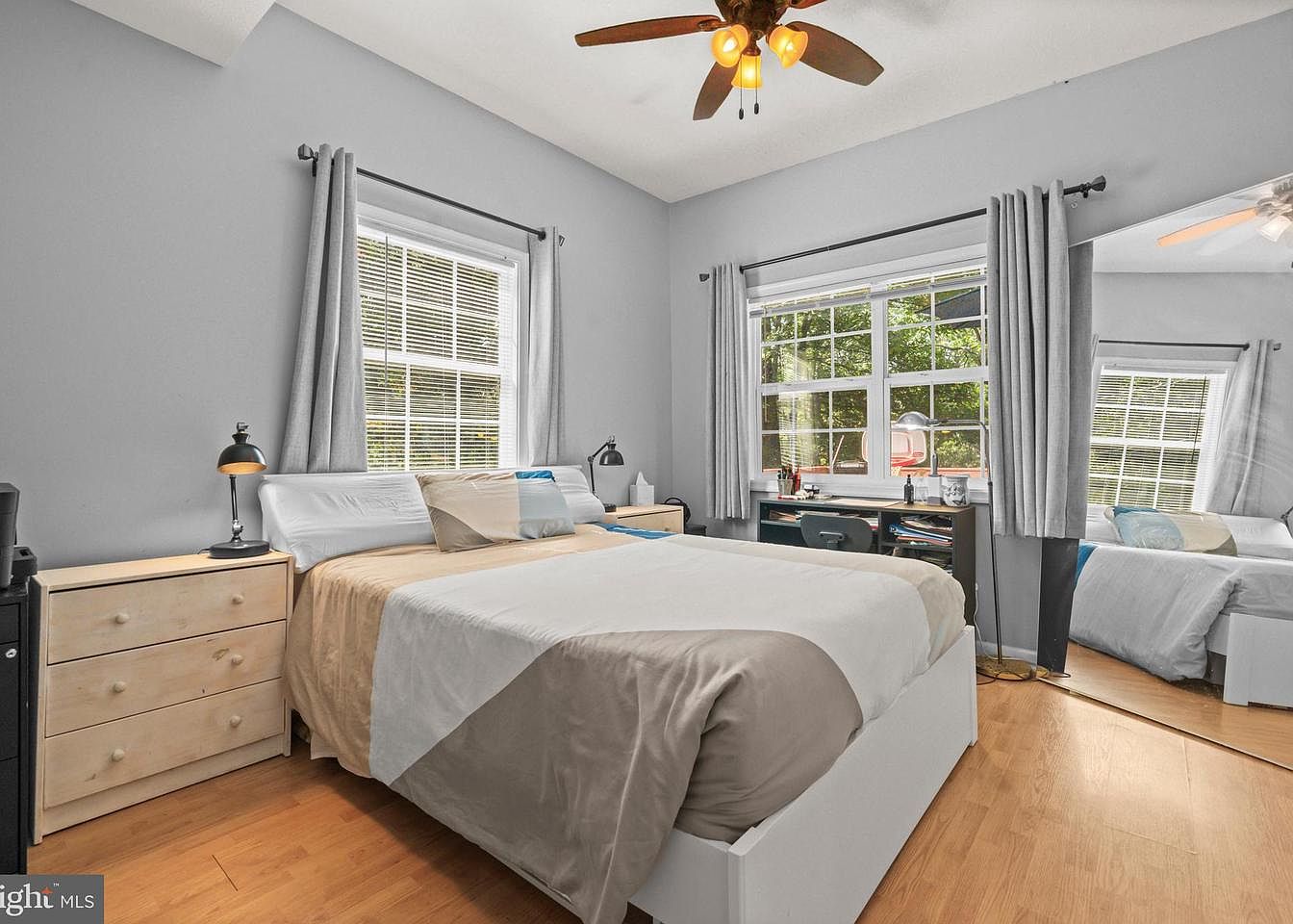This serene bedroom features a light gray color scheme that creates a calming atmosphere. A spacious bed is dressed in neutral bedding with a hint of color through accent pillows. Soft, elegant curtains frame large windows, allowing abundant natural light. To the side, a simple nightstand with a sleek lamp enhances functionality. A work desk, neatly organized against the far wall, showcases practicality without sacrificing style. The wooden flooring adds warmth, complementing the overall aesthetic. A large mirror reflects the room, contributing an illusion of space and openness, while a ceiling fan provides a stylish cooling option.