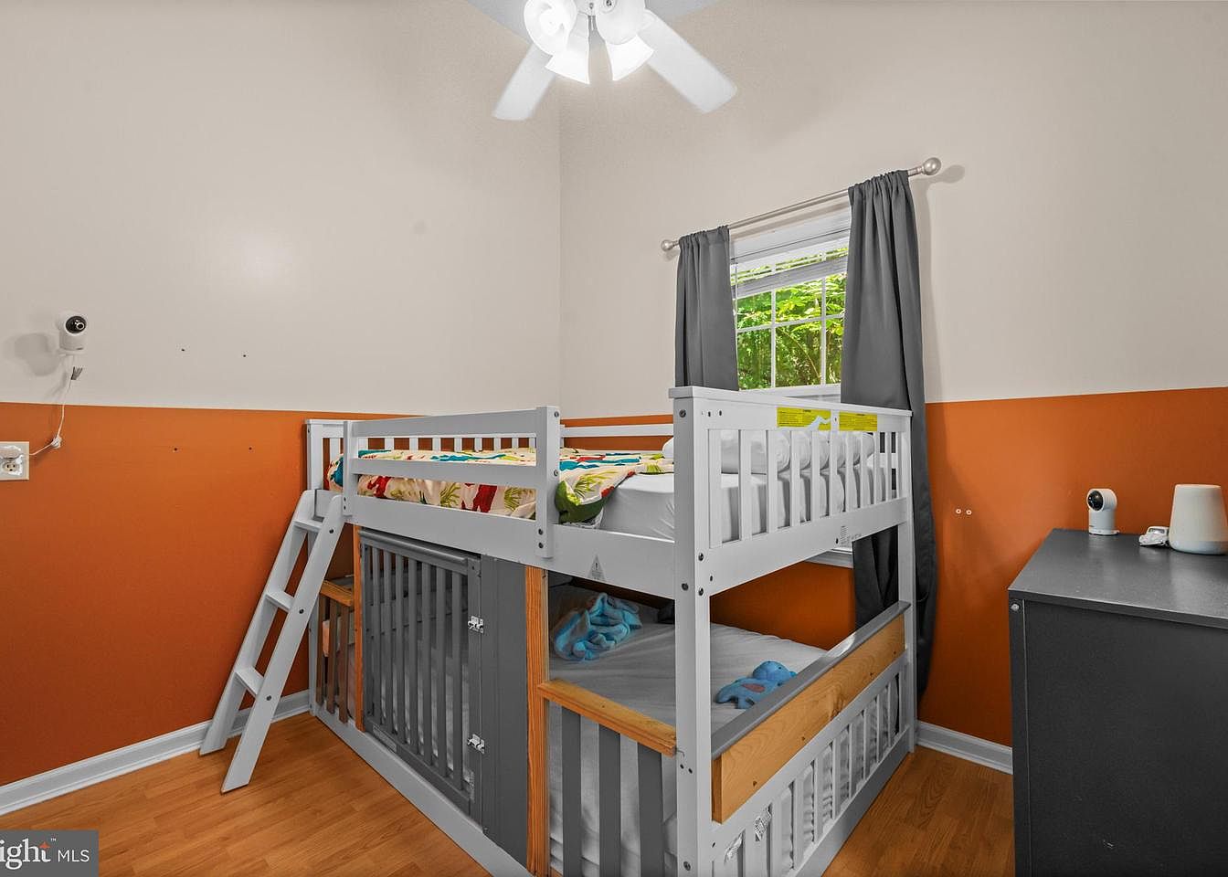 This cozy kids’ bedroom features a thoughtfully designed bunk bed, maximizing space for play and rest. The lower bunk is enclosed with wooden slats, enhancing safety, while the upper bunk boasts colorful bedding adorned with playful patterns. An orange accent wall contrasts with the light cream upper walls, creating a vibrant yet soothing atmosphere. A large window dressed in gray curtains allows natural light to brighten the room, complemented by a ceiling fan that aids in ventilation. A small nightstand in a dark shade provides a convenient spot for essentials, making this room ideal for children’s comfort and creativity.