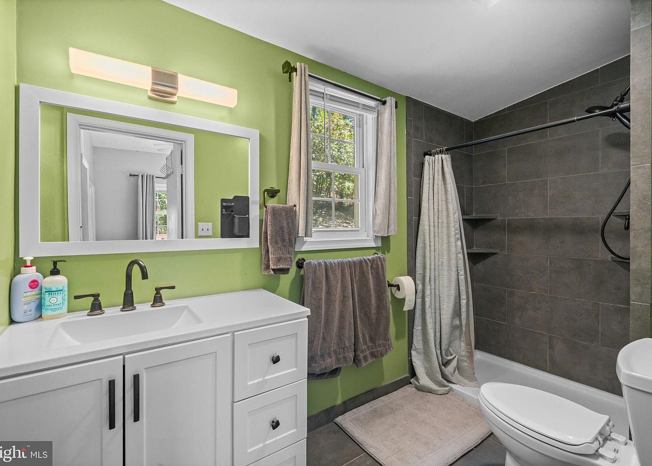 This bathroom features a modern design with an inviting color scheme, highlighted by fresh green walls that create a lively atmosphere. A sleek white vanity with black hardware contrasts elegantly with the bold walls. Above, a large rectangular mirror captures natural light from the window, enhancing the spacious feel. The shower area is adorned with dark tiles providing a sophisticated backdrop, complemented by a soft cream shower curtain. Textured towels hang neatly, adding warmth and practicality. Subtle accessories like a soap dispenser and a towel bar complete the design, offering both functionality and style.