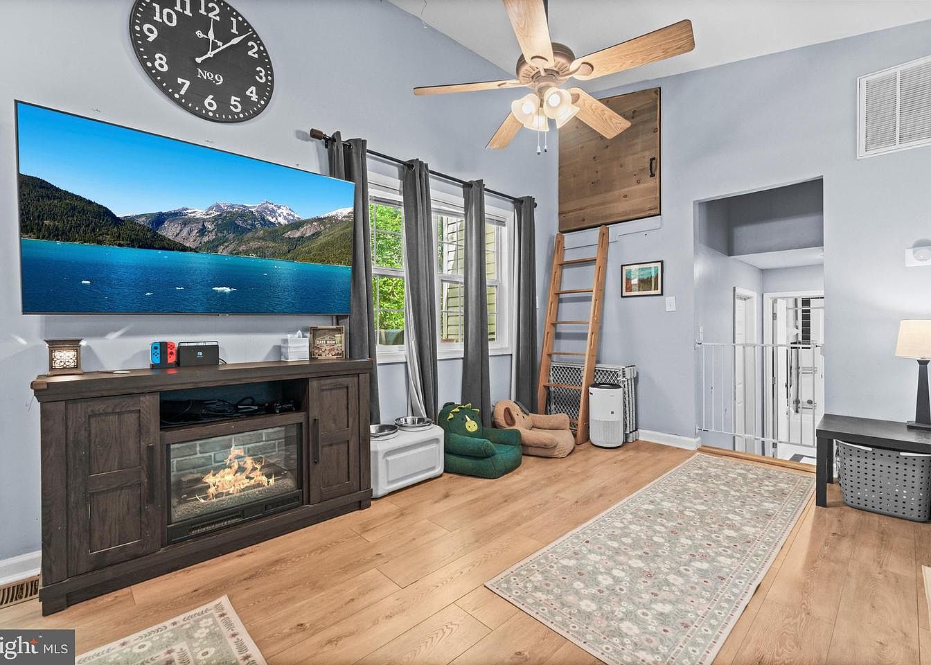 A cozy living room area featuring a large flat-screen TV mounted on a light blue wall, displaying a serene mountain lake scene. Below, a dark wooden media console houses a faux fireplace, enhancing warmth. Soft gray curtains frame the windows, allowing for natural light. A decorative rug with floral patterns adds texture to the wooden floor. A ladder leads to a loft space, while a small air purifier is placed beside a plush green pet bed. Adjacent, a modern lamp provides soft illumination. The overall ambiance blends rustic and contemporary styles, creating a welcoming and relaxing environment.