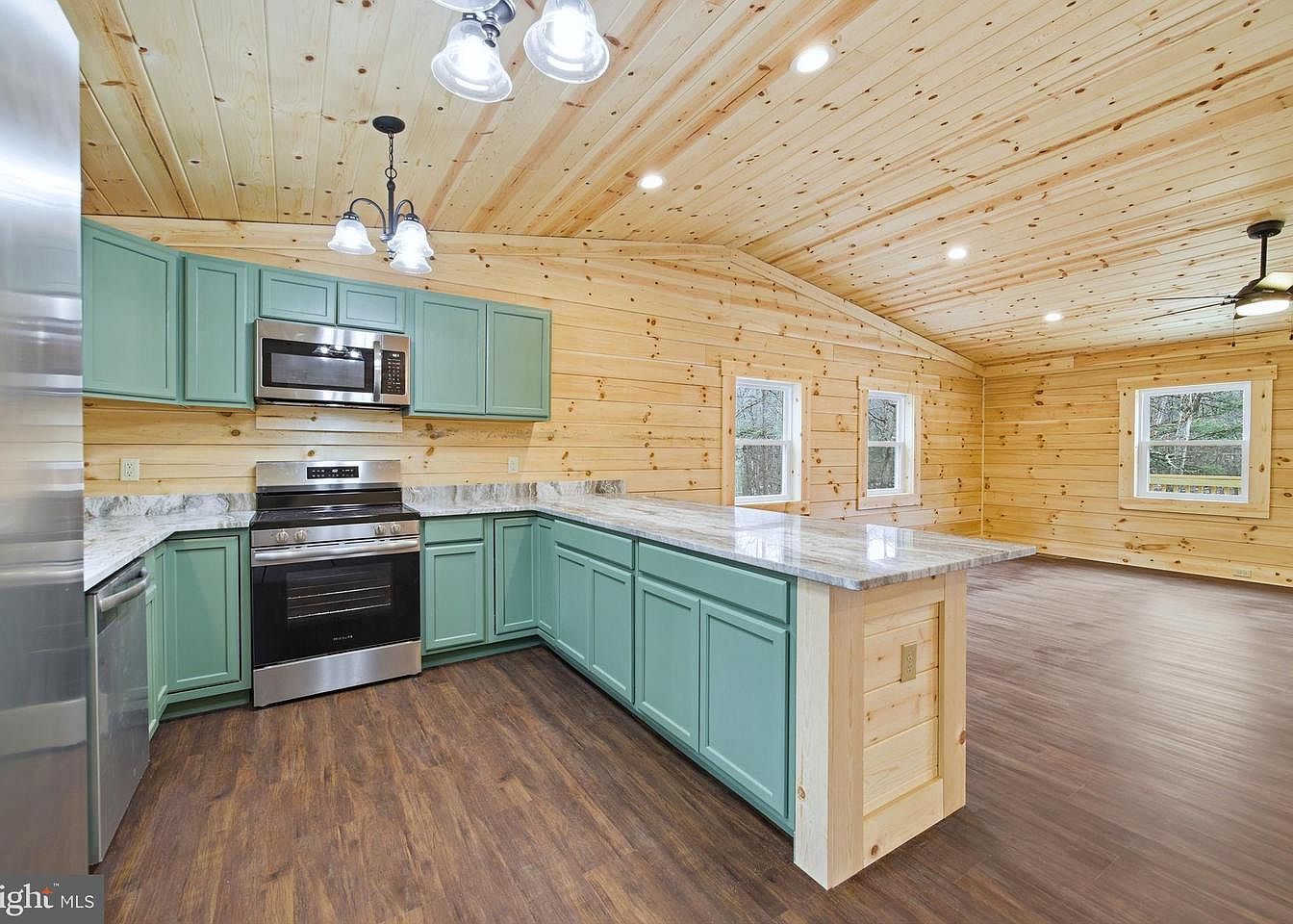This kitchen features an open layout with a rustic charm, defined by pine wood paneling on walls and ceiling. The light wooden tones contrast beautifully with the striking teal cabinetry, giving a fresh, inviting feel. A spacious island with a polished granite countertop enhances functionality, providing extra prep space. Stainless steel appliances, including a microwave and oven, add a modern touch against the warmth of the wood. Ample natural light floods in through multiple windows, brightening the space. Elegant pendant lighting hangs above the island, complementing subtle recessed lights that illuminate this cozy yet modern kitchen.