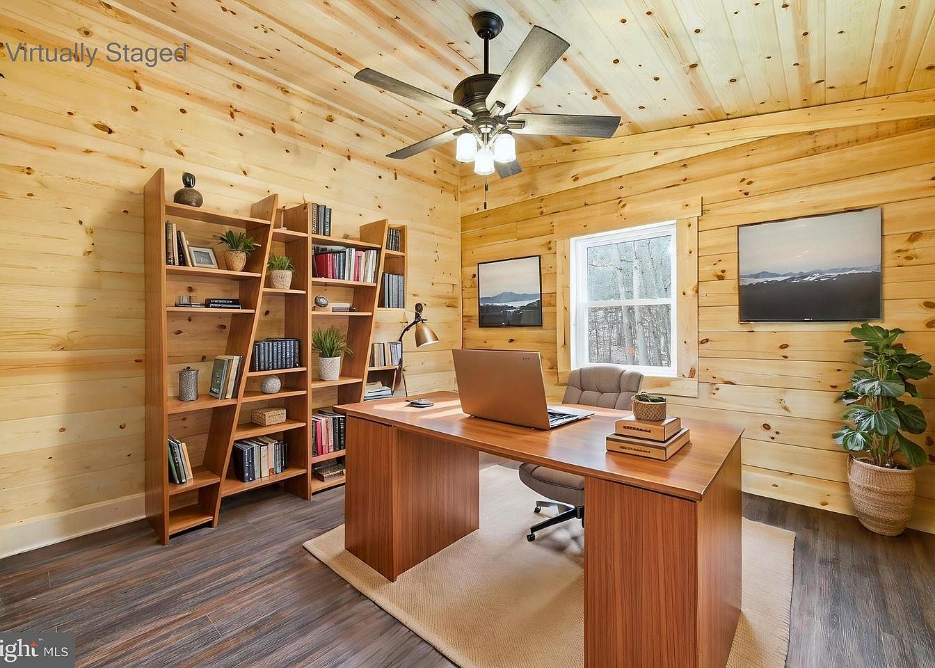 This cozy home office features warm wooden walls and a ceiling, enhancing a rustic atmosphere. A sleek, modern desk made of rich wood is centrally placed, complemented by a comfortable, gray office chair. Behind the desk, an elegant bookshelf with an angled design displays a collection of books and decorative plants. Natural light streams through a window, illuminating the space and highlighting a pair of wall-mounted photographs. A ceiling fan with light fixtures adds functionality, while a light area rug underfoot ties the room together, creating an inviting and productive work environment.
