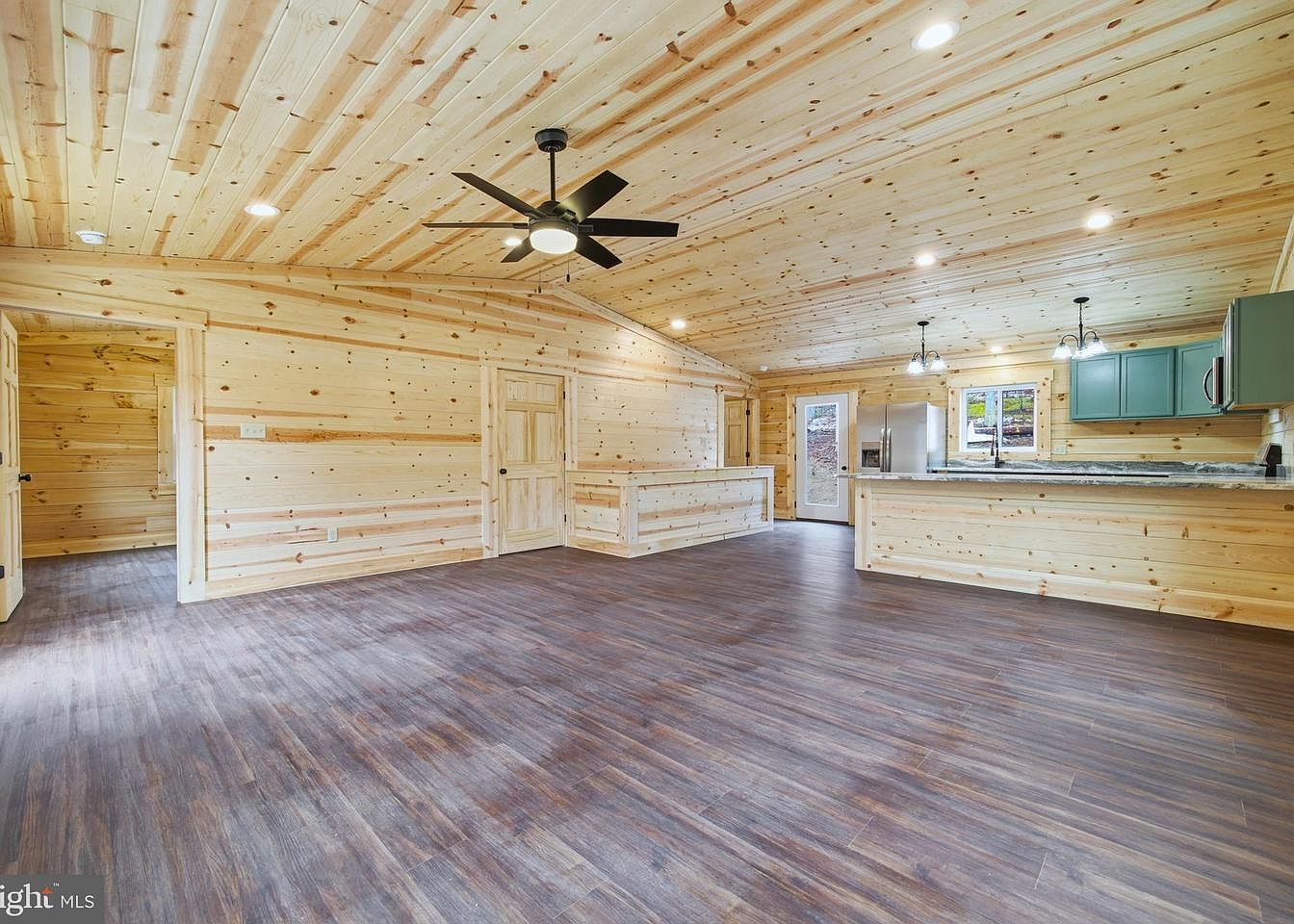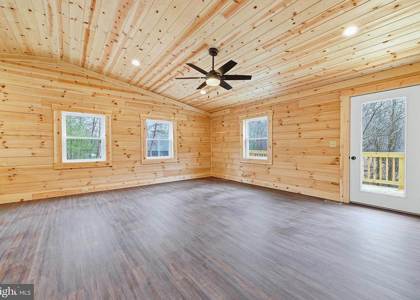 A spacious living room featuring a warm aesthetic with natural wood paneling throughout. The ceiling showcases a finely constructed wood design, enhancing the cozy atmosphere. Four strategically placed windows allow ample natural light to flood the room, framed by white trim that complements the wood tones. The floor is covered with a rich, dark laminate that contrasts beautifully with the lighter wood hues. A contemporary ceiling fan hangs centrally, providing both style and comfort. The room’s open layout invites various furniture arrangements, offering flexibility for relaxation and entertaining.